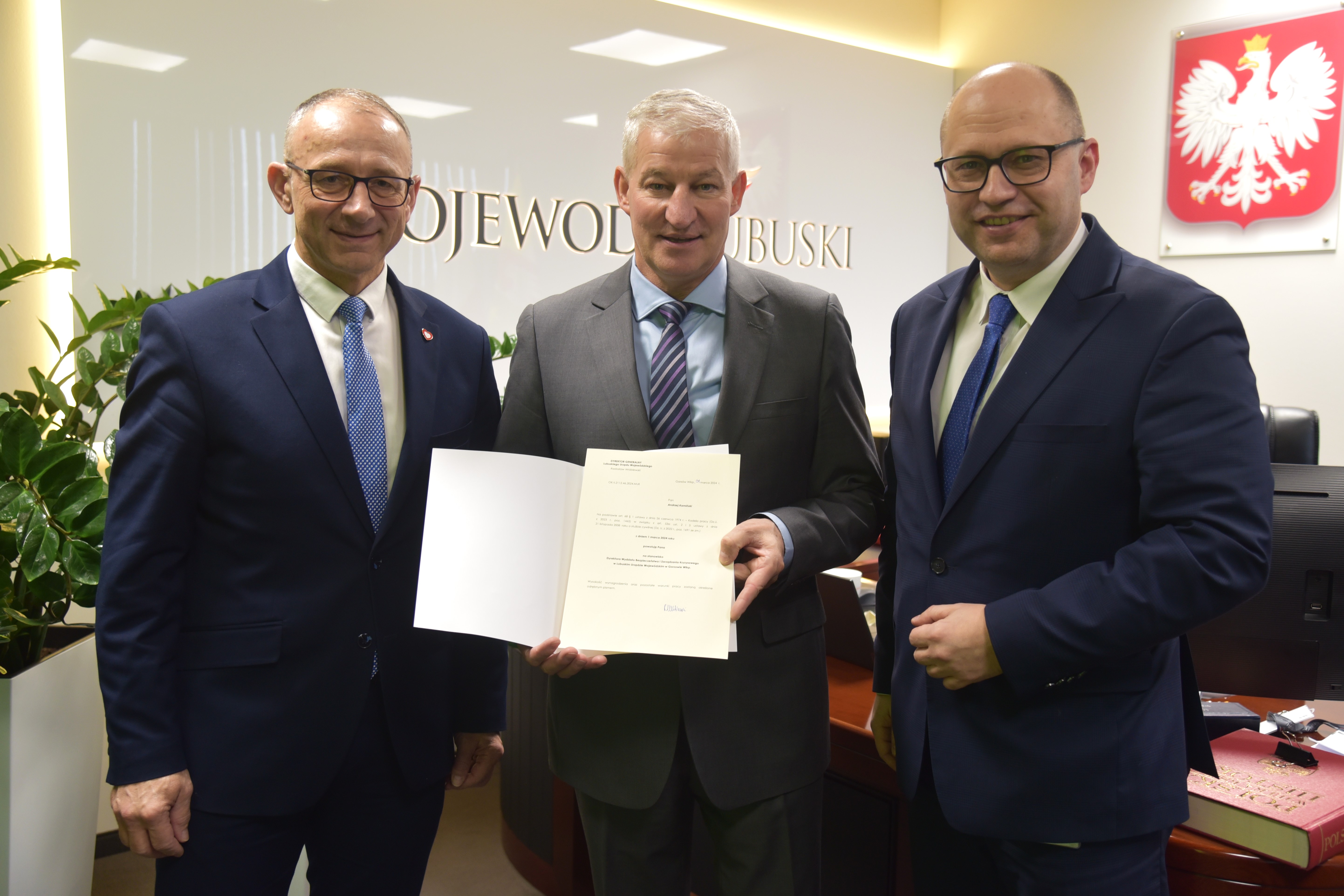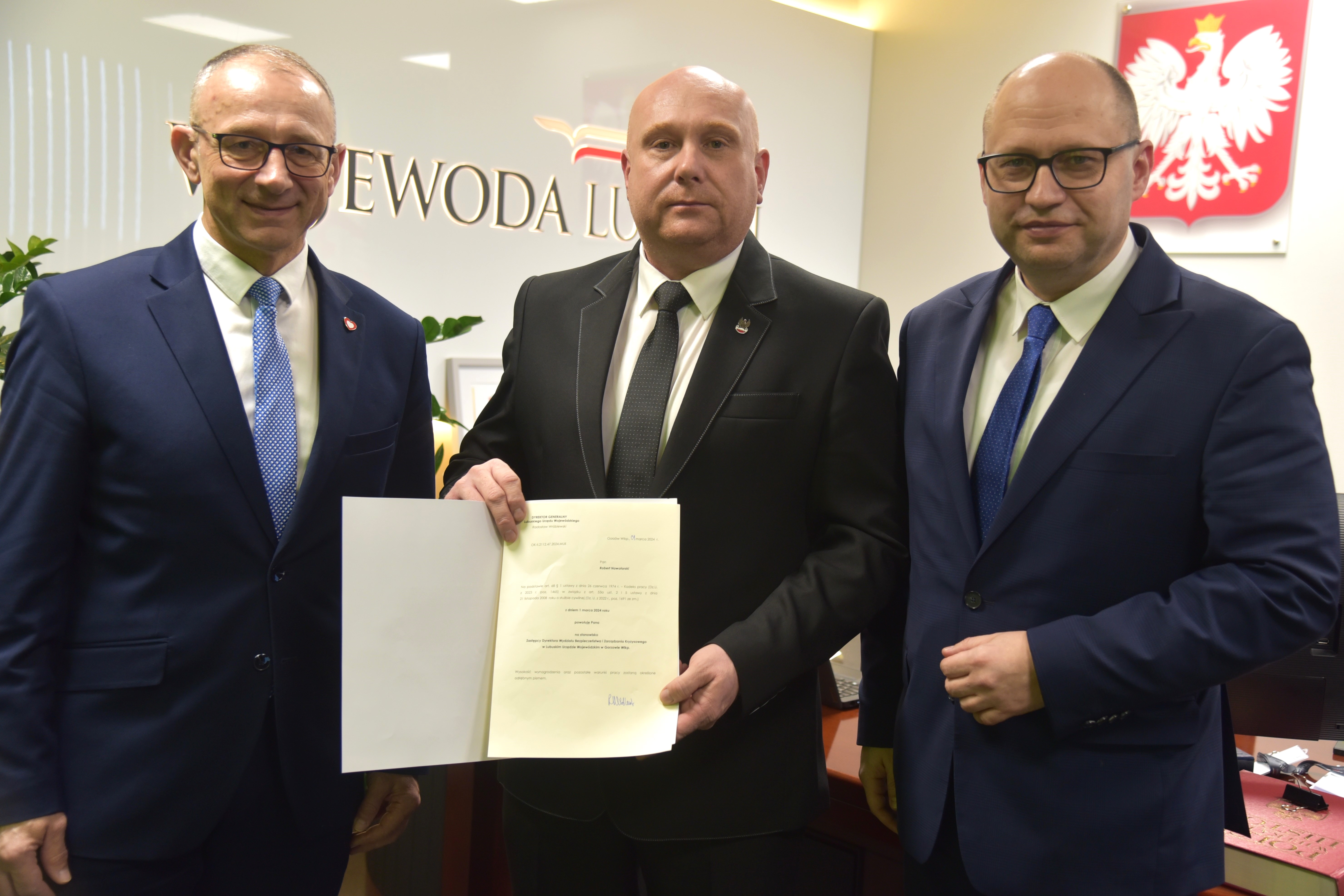 Radosław Wróblewski, Dyrektor Generalny Lubuskiego Urzędu Wojewódzkiego z dniem 1 marca 2024 r. powołał do kierowania Wydziałem Bezpieczeństwa i Zarządzania Kryzysowego na stanowisko Dyrektora – Pana Andrzeja Kamińskiego. Jego zastępcą został Pan Robert Nowotorski.