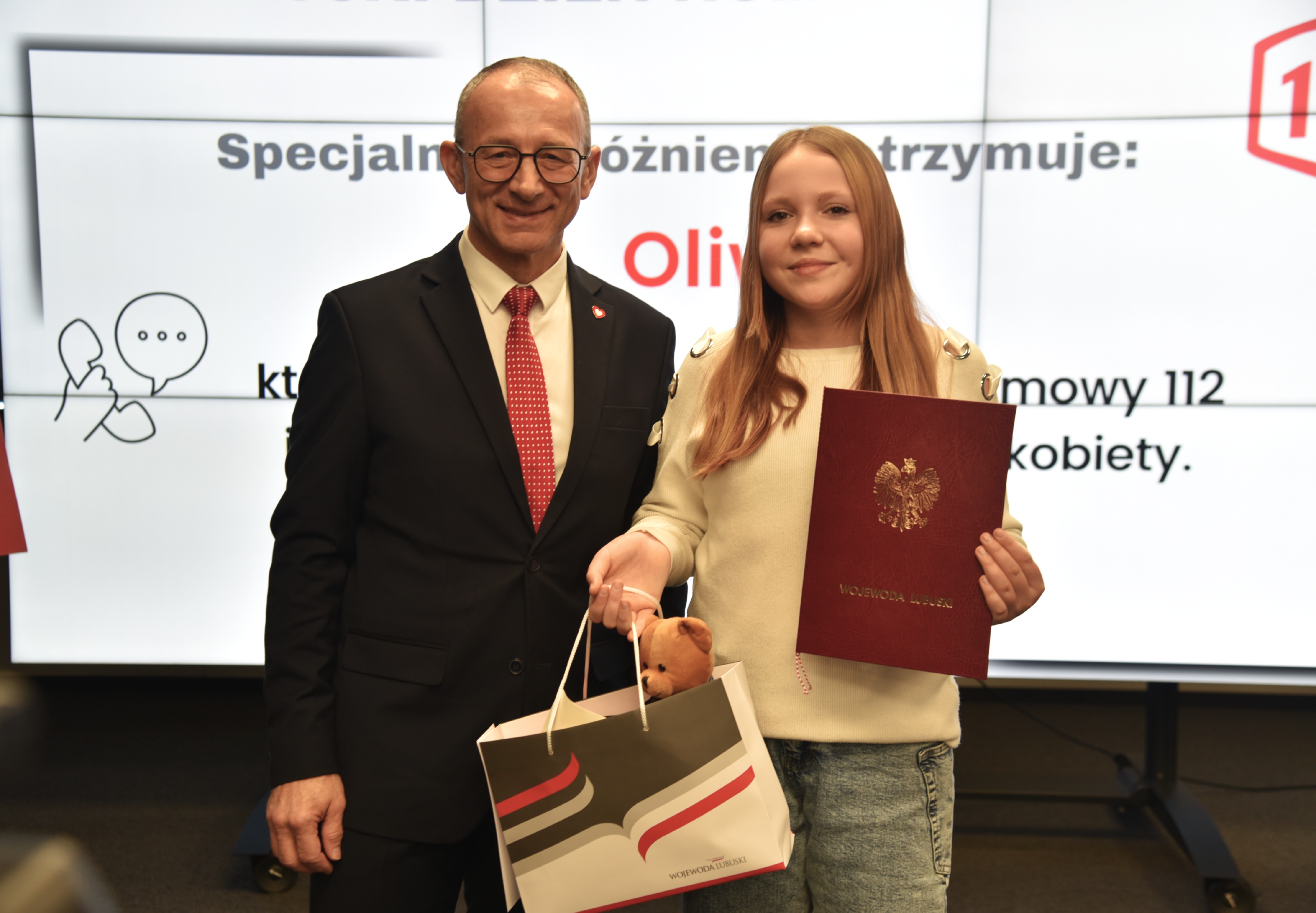 Szczególne wyróżnienie otrzymała Oliwia, 13-letnia uczennica Szkoły Podstawowej nr 10 w Zielonej Górze. 26 listopada 2024 roku Oliwia zadzwoniła na numer 112 i skutecznie wezwała pomoc do starszej kobiety, która przewróciła się wysiadając z autobusu. Dzięki jej szybkiej reakcji i sprawnemu przekazaniu informacji, poszkodowana otrzymała niezbędną pomoc medyczną.