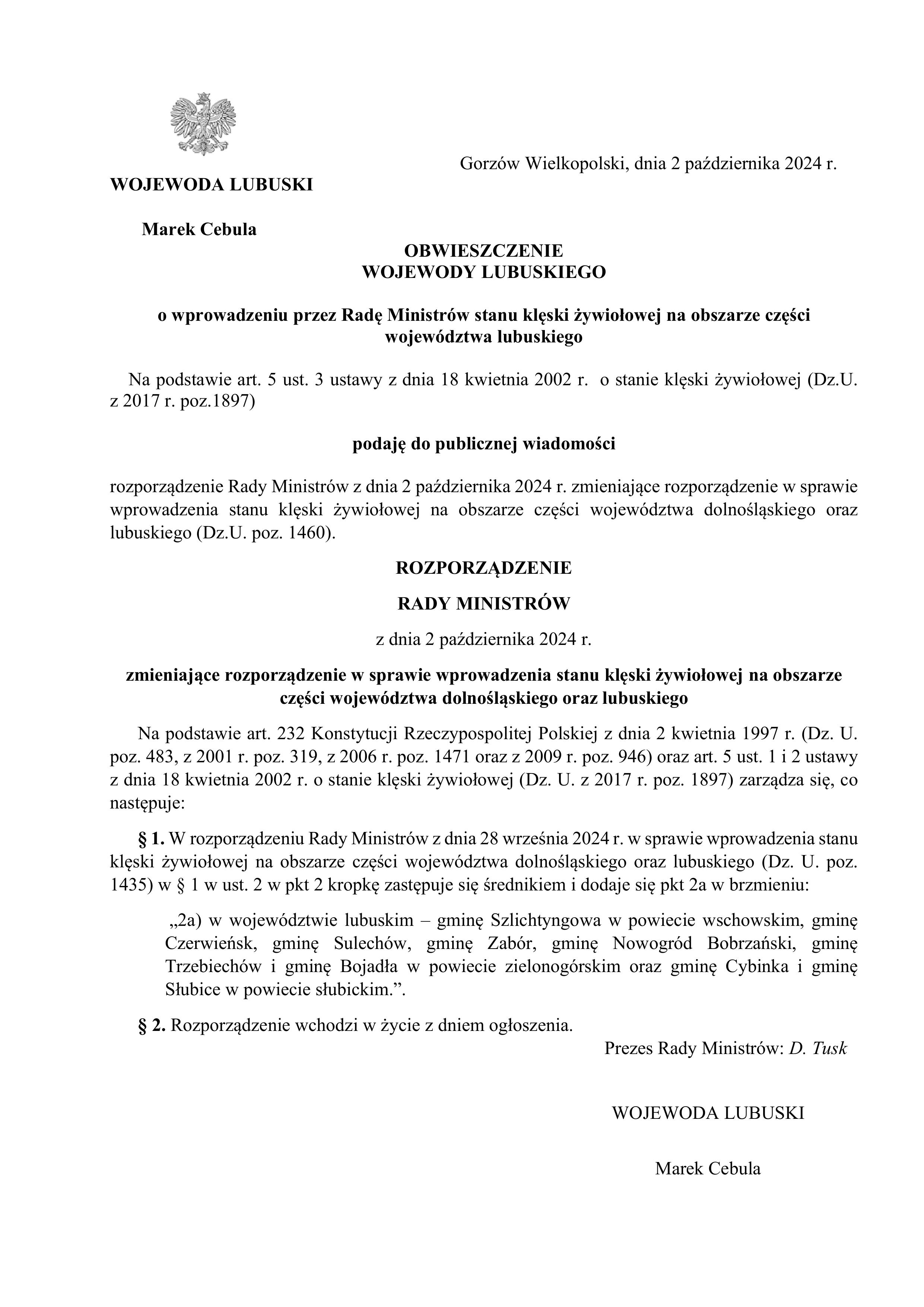 z 2017 r. poz.1897) podaję do publicznej wiadomości rozporządzenie Rady Ministrów z dnia 2 października 2024 r. zmieniające rozporządzenie w sprawie wprowadzenia stanu klęski żywiołowej na obszarze części województwa dolnośląskiego oraz lubuskiego (Dz.U. poz. 1460).