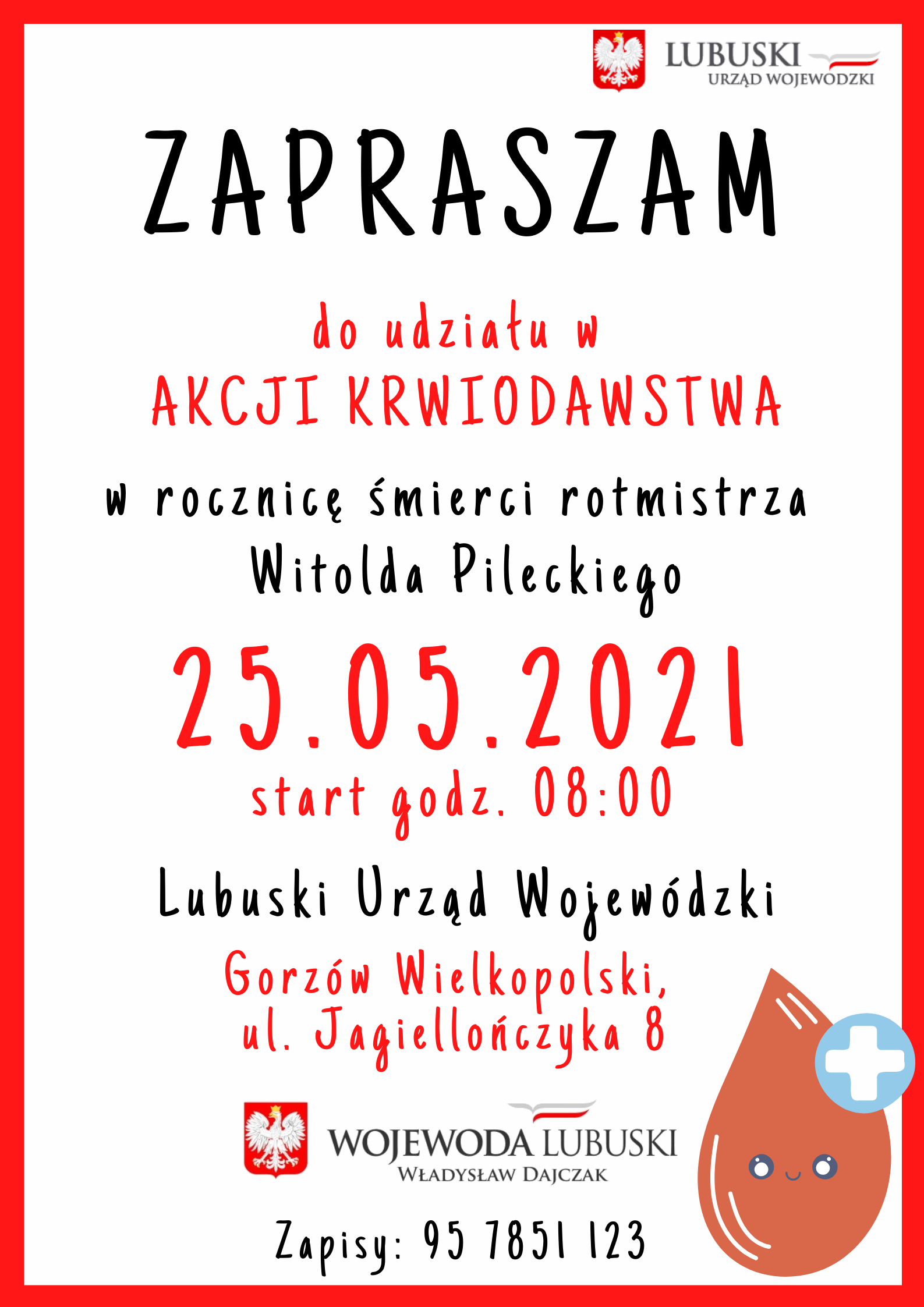 Zapraszamy wszystkich chętnych Lubuszan do wzięcia udziału w Akcji Krwiodawstwa w rocznicę śmierci rotmistrza Witolda Pileckiego dnia 25.05.2021r.