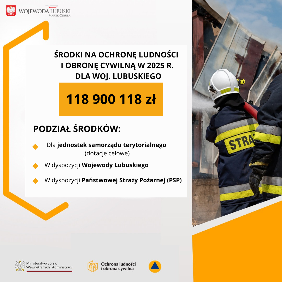 W latach 2025-2026 na realizację Programu Ochrony Ludności i Obrony Cywilnej w skali kraju przeznaczono odpowiednio 16,7 mld zł i 17,2 mld zł. Środki trafią do województw, samorządów, będą przeznaczone na zadania centralne i strategiczne. Każde województwo otrzyma wsparcie dostosowane do lokalnych potrzeb. Do Lubuskiego z budżetu państwa na finansowanie zadań z zakresu ochrony ludności i obrony cywilnej w 2025 r. trafi 118 900 118 zł.