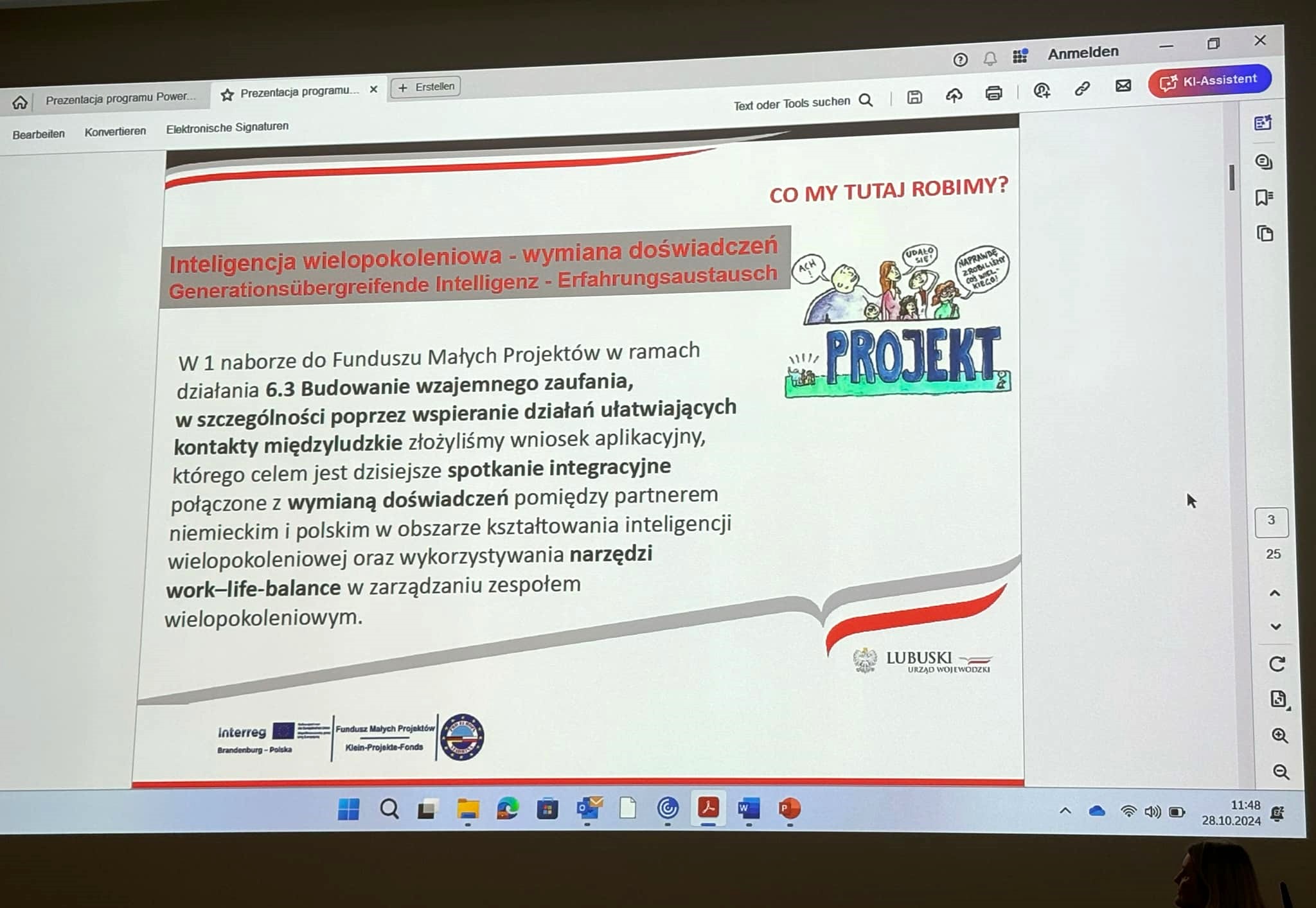 Lubuski Urząd Wojewódzki przy współpracy z Investitionsbank des Landes Brandenburg w Poczdamie przystąpił do realizacji projektu „Inteligencja wielopokoleniowa – wymiana doświadczeń” w ramach Funduszu Małych Projektów w Euroregionie PRO EUROPA VIADRINA Programu Współpracy INTERREG VI A Brandenburgia – Polska 2021-2027.