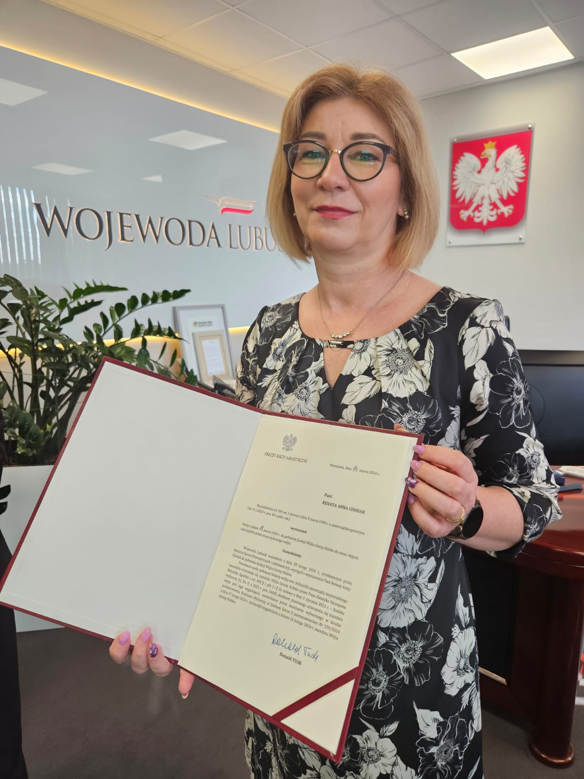 Wojewoda Lubuski wnioskiem z dnia 28 lutego 2024 r., przekazanym przez Ministra Spraw Wewnętrznych i Administracji wystąpił o wyznaczenie Pani Renaty Chodak do pełniania funkcji Wójta Gminy Kolsko - po stwierdzeniu wygaśnięcia mandatu Wójta Gminy, Pana Henryka Matysika z dniam 26 lutego 2024 r.