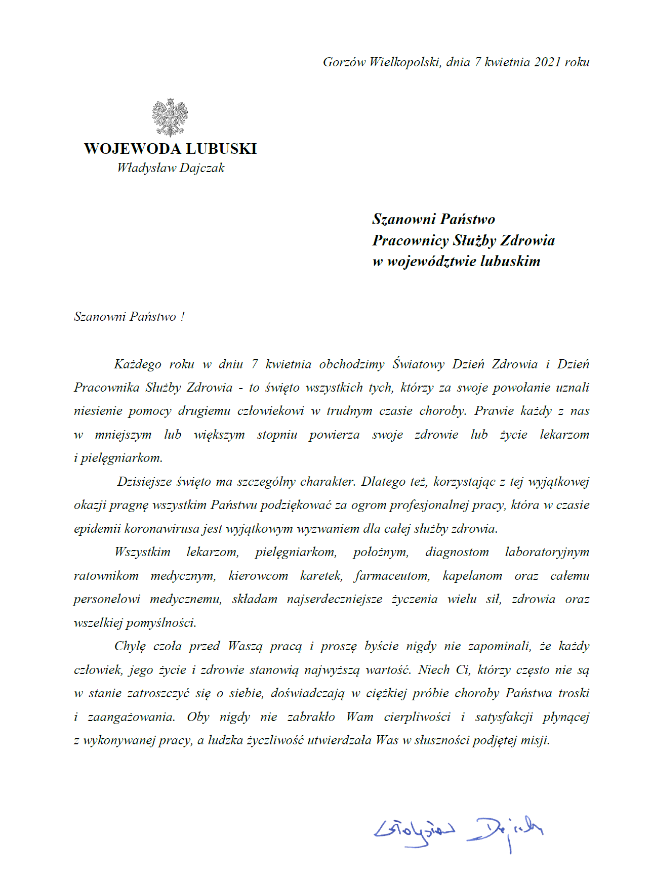 List Wojewody Lubuskiego Władysława Dajczaka z okazji Światowego Dnia Zdrowia i Dnia Pracownika Służby Zdrowia