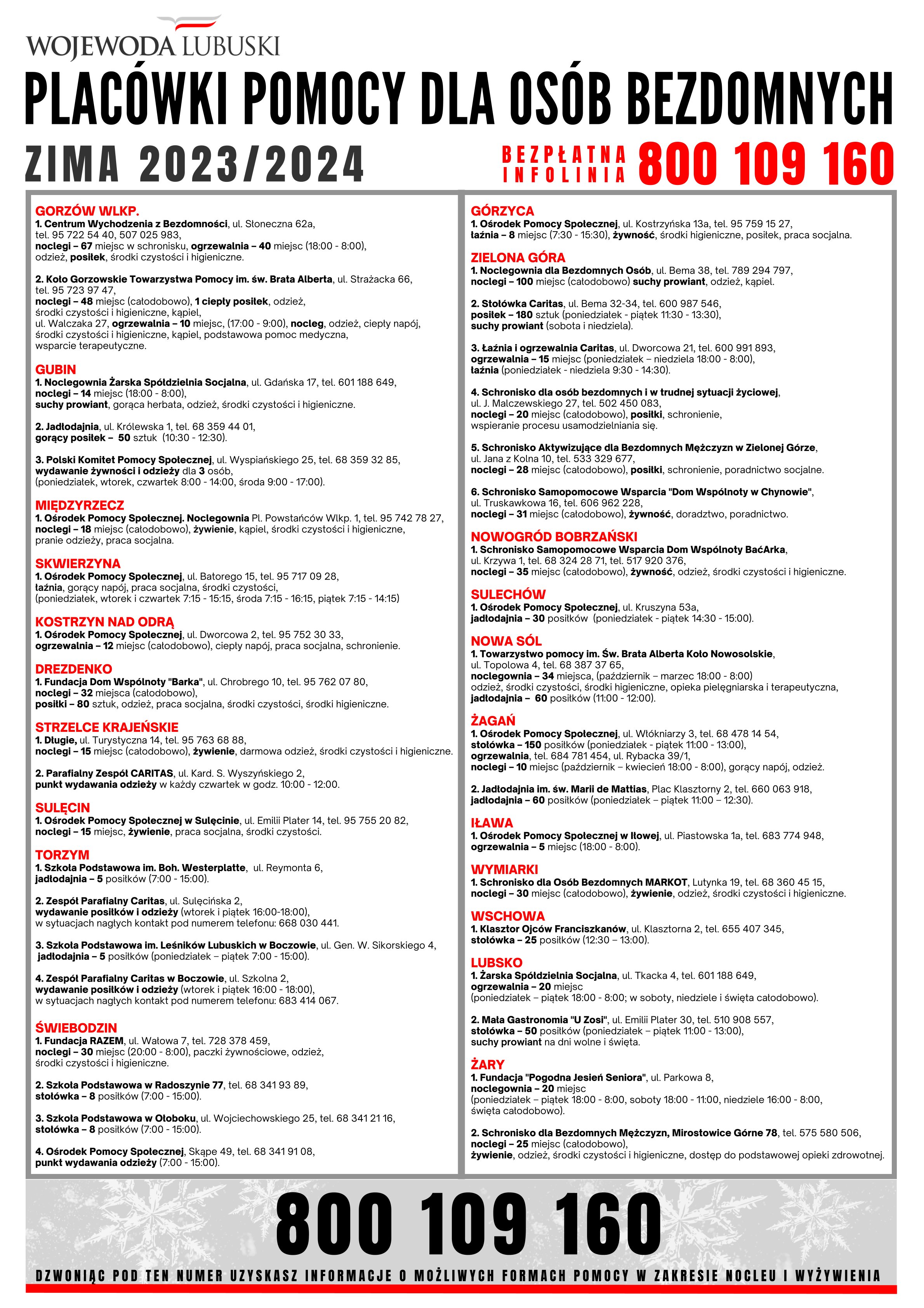 Plakat ze spisem placówek świadczących pomoc osobom bezdomnym na terenie województwa lubuskiego znajduje się poniżej. Wykorzystajmy zawarte na nim informacje do udzielenia pomocy szczególnie potrzebującym, w tym także chorym