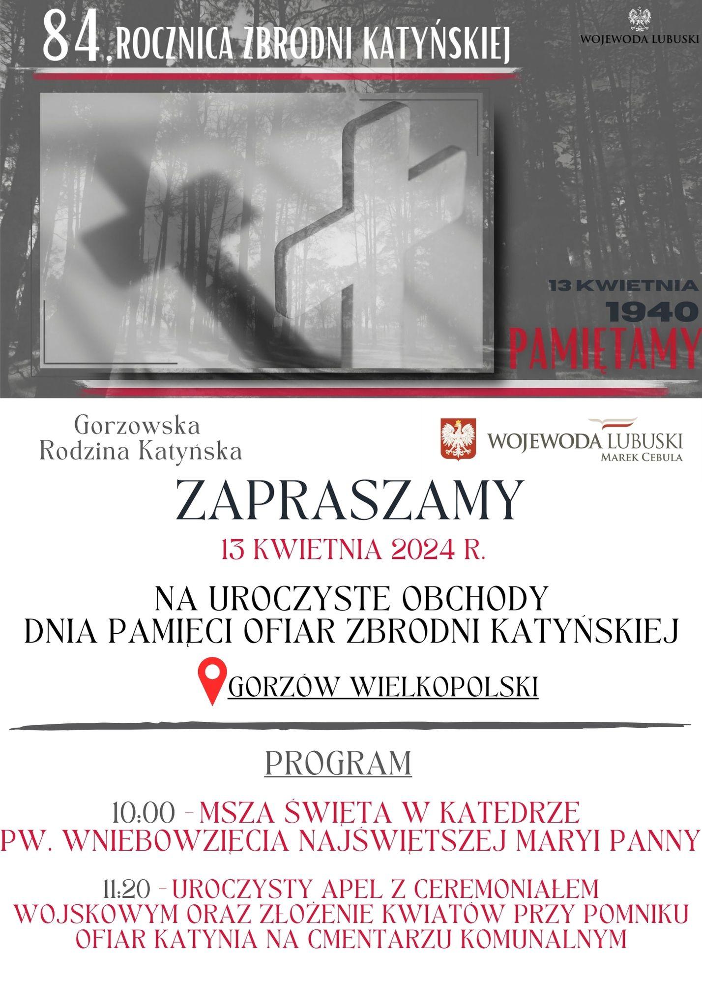 Dla uczczenia pamięci o tych tragicznych wydarzeniach, w 84. rocznicę zbrodni katyńskiej, zapraszamy do udziału w uroczystościach, które odbędą się w najbliższą sobotę, tj. 13 kwietnia 2024 r. w Gorzowie Wlkp.