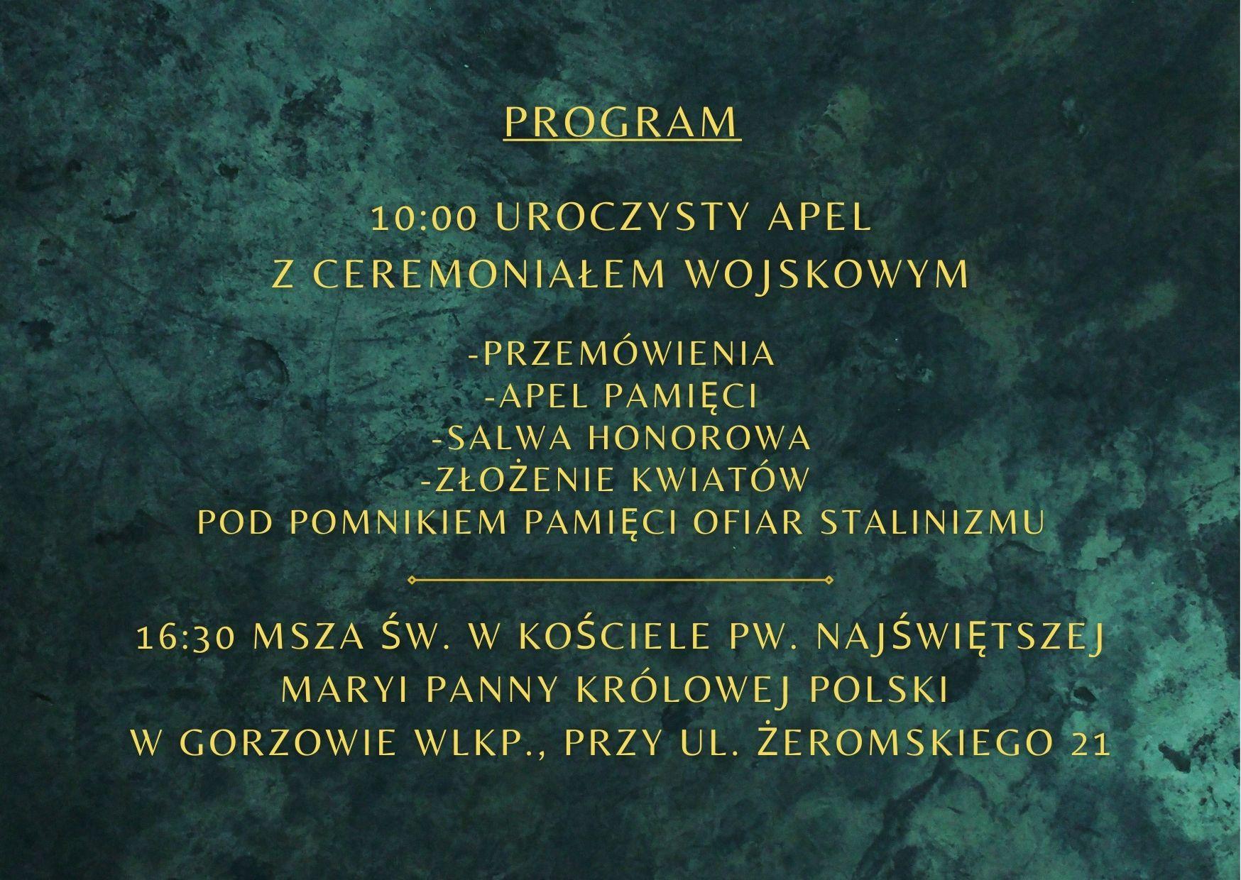 - godz. 10:00 Uroczysty Apel z ceremoniałem wojskowym na Cmentarzu Komunalnym w Gorzowie Wlkp., przy ul. Żwirowej 5:
