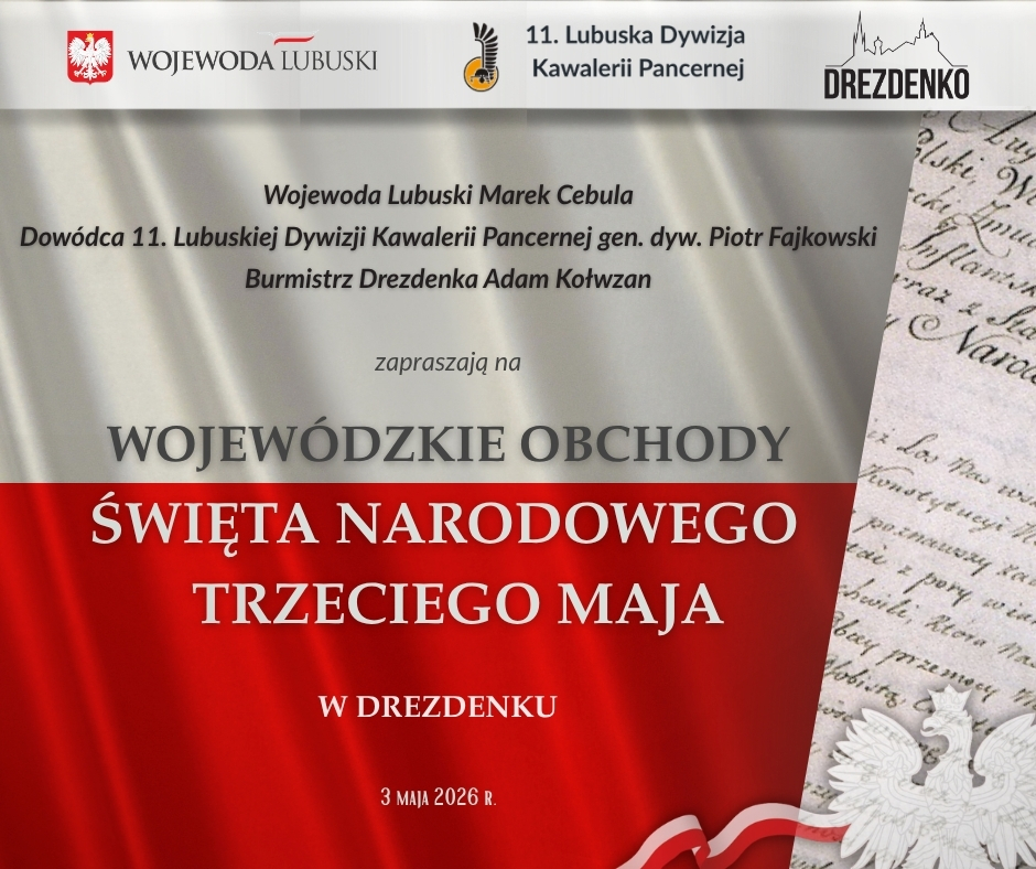 zapraszają serdecznie na Wojewódzkie Obchody Święta Narodowego Trzeciego Maja, które w tym roku odbędą się w Drezdenku.