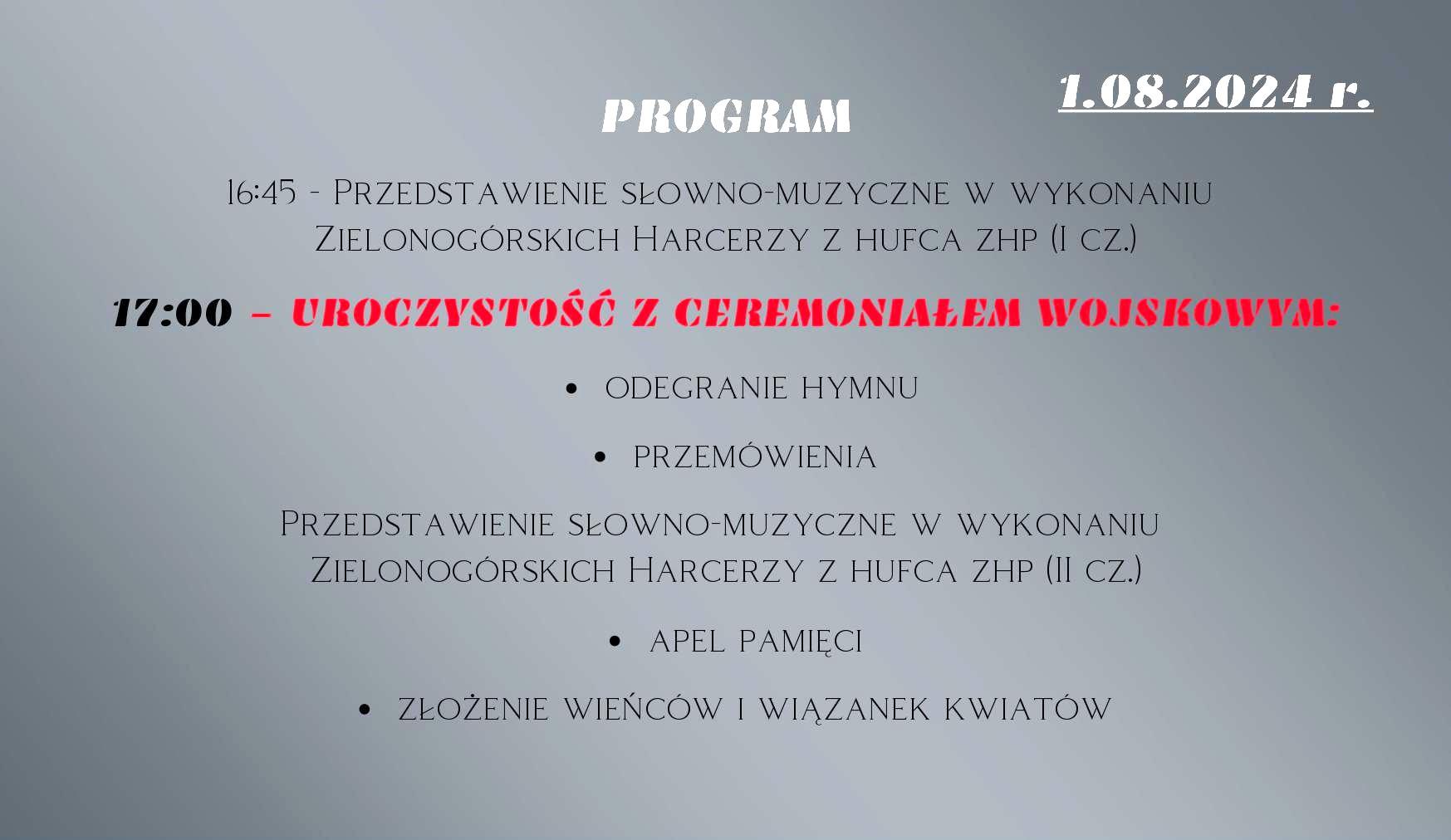 Wojewódzkie Obchody 80. rocznicy wybuchu Powstania Warszawskiego odbędą się 1 sierpnia 2024 roku w Zielonej Górze - przy obelisku poświęconym Żołnierzom Armii Krajowej i Szarych Szeregów na Cmentarzu Komunalnym przy ul. Wrocławskiej, zgodnie z poniższym harmonogramem: