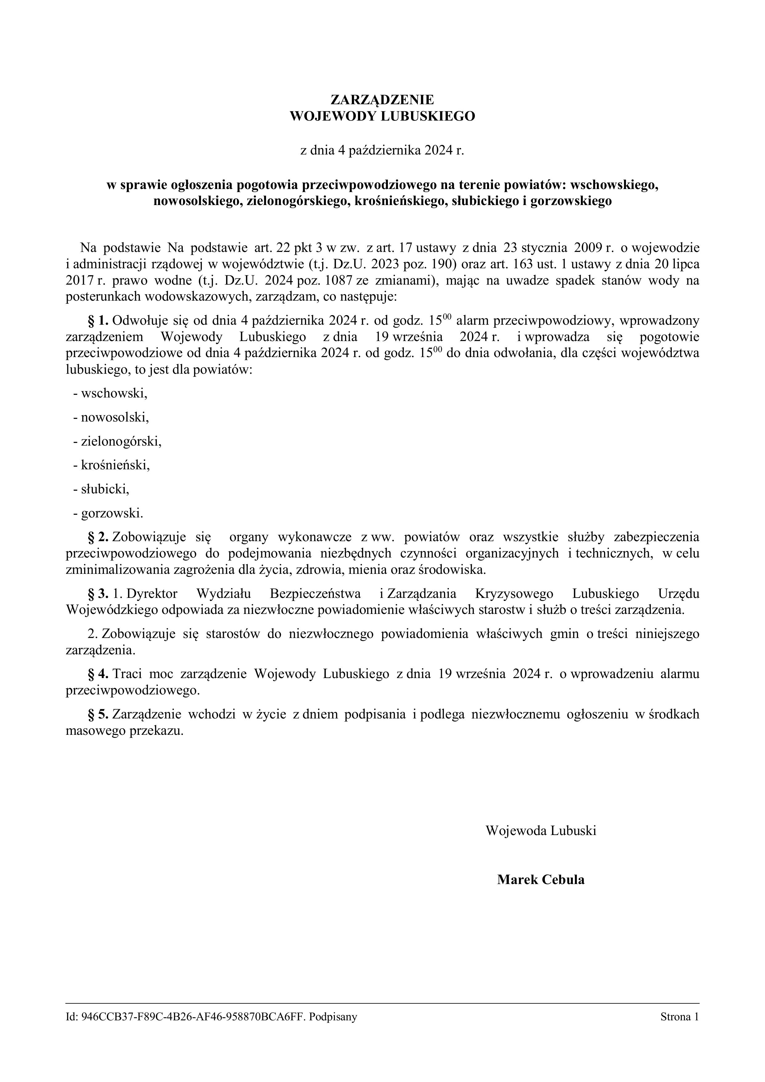 Odwołuje się od dnia 4 października 2024 r. od godz. 15:00 alarm przeciwpowodziowy, wprowadzony zarządzeniem Wojewody Lubuskiego z dnia 19 września 2024 r. i wprowadza się pogotowie przeciwpowodziowe od dnia 4 października 2024 r. od godz. 15:00 do dnia odwołania, dla części województwa lubuskiego, to jest dla powiatów: