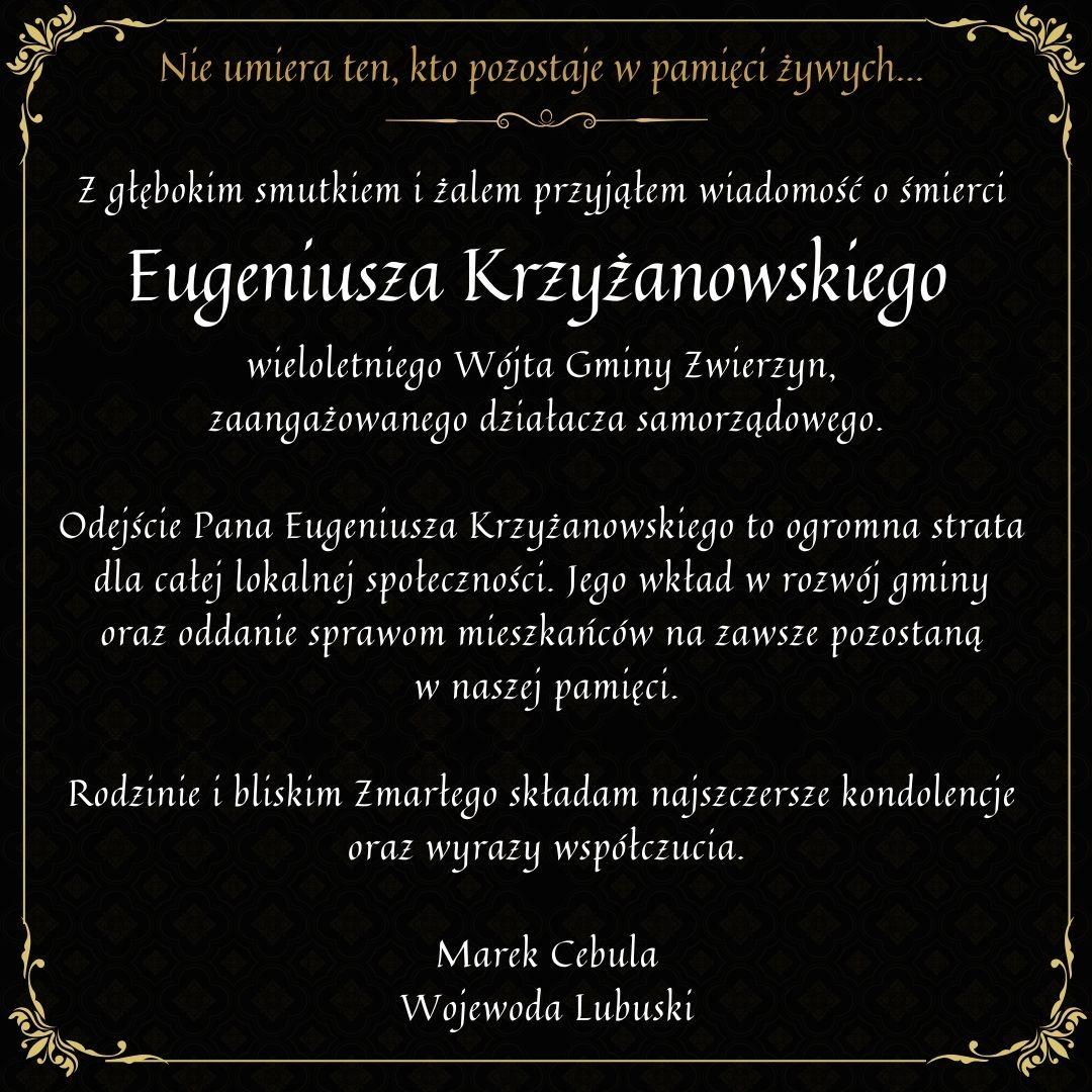Z głębokim smutkiem i żalem przyjąłem wiadomość o śmierci Eugeniusza Krzyżanowskiego, wieloletniego Wójta Gminy Zwierzyn, zaangażowanego działacza samorządowego.