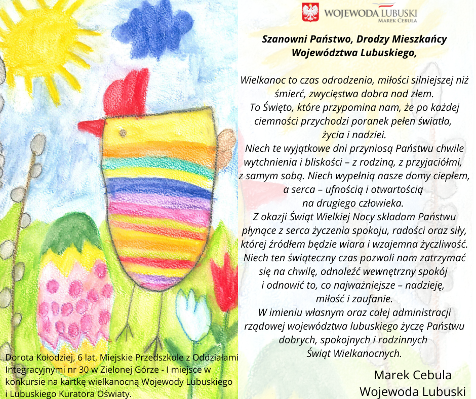 W imieniu własnym oraz całej administracji rządowej województwa lubuskiego życzę Państwu dobrych, spokojnych i rodzinnych Świąt Wielkanocnych.