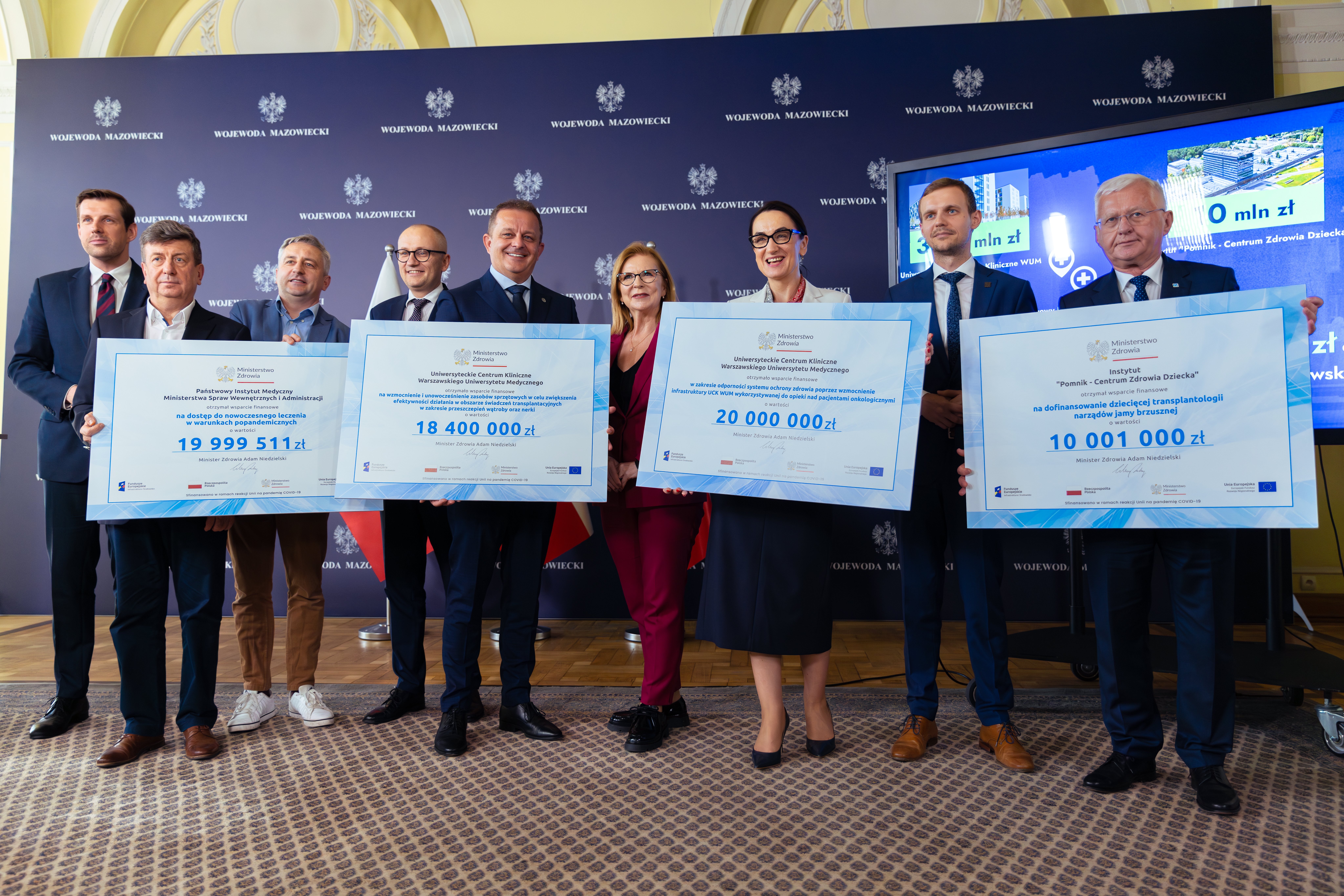 Trzy szpitale z Warszawy otrzymały łącznie 68,3 mln zł z unijnej inicjatywy REACT – EU Programu Operacyjnego Infrastruktura i Środowisko w ramach wspierania naprawy i odporności systemu zdrowia. W uroczystości wręczenia symbolicznych czeków dyrektorom szpitali udział wzięli: Wicemarszałek Sejmu RP Małgorzata Gosiewska, Podsekretarz Stanu w Ministerstwie Zdrowia Marcin Martyniak, Podsekretarz Stanu w Ministerstwie Spraw Wewnętrznych i Administracji Błażej Poboży, Wojewoda Mazowiecki Tobiasz Bocheński. Wydarzenie odbyło się 30 czerwca br. w Mazowieckim Urzędzie Wojewódzkim w Warszawie.