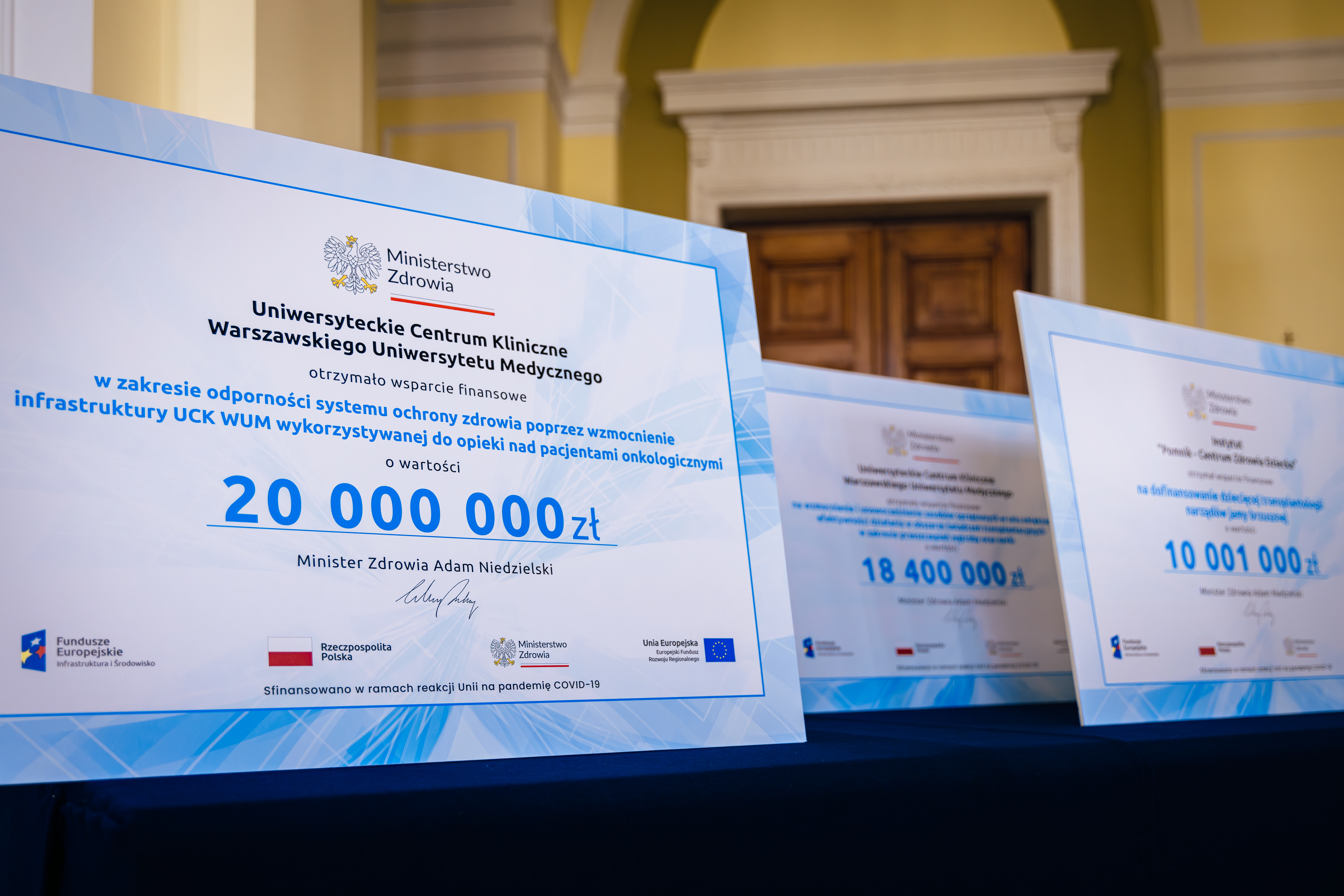 - Uniwersyteckie Centrum Kliniczne Warszawskiego Uniwersytetu Medycznego na kwotę 20 mln zł (całość pochodzi ze środków unijnych) na wsparcie odporności systemu ochrony zdrowia poprzez wzmocnienie infrastruktury UCK WUM wykorzystywanej do opieki nad pacjentami onkologicznymi oraz na kwotę 18,4 mln zł (całość pochodzi ze środków unijnych) na wzmocnienie i unowocześnienie zasobów sprzętowych w celu zwiększenia efektywności działania w obszarze świadczeń transplantacyjnych w zakresie przeszczepień wątroby oraz nerki;