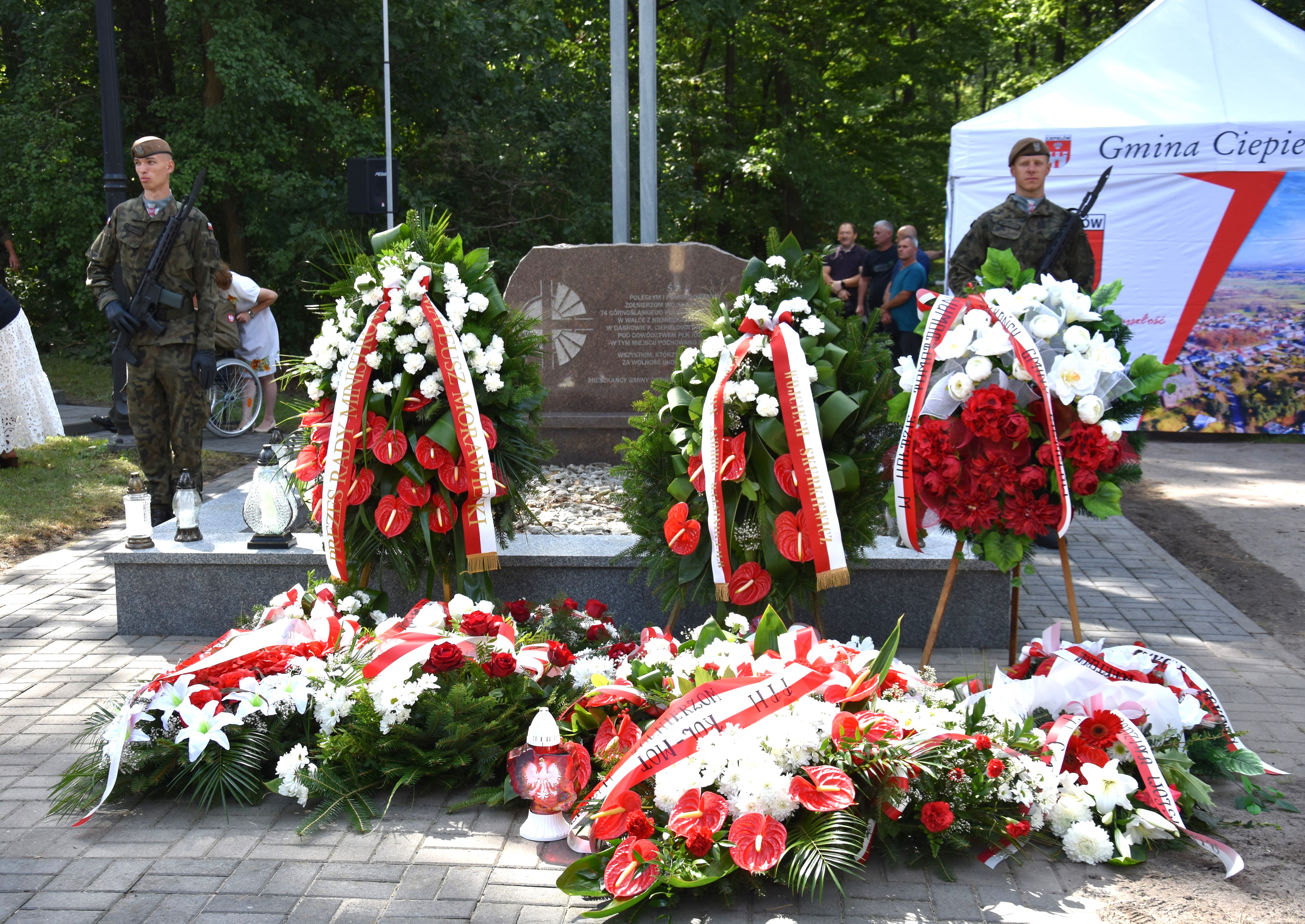 W piątek, 8 września br. przy żołnierskiej mogile, na leśnej polanie w Dąbrowie pod Ciepielowem odbyły się uroczystości patriotyczne upamiętniające ofiary niemieckiej zbrodni wojennej, popełnionej przez Wehrmacht 9 września 1939 roku na żołnierzach polskich – jeńcach wojennych z 74. Górnośląskiego Pułku Piechoty z Lublińca. Hołd zamordowanym żołnierzom oddali m.in. Wiceminister Obrony Narodowej Wojciech Skurkiewicz, Starosta Powiatu Lipskiego Sławomir Śmieciuch, Wójt Gminy Ciepielów Artur Szewczyk, Komendant Garnizonu Wojska Polskiego w Radomiu ppłk Ireneusz Bębenek. Wieniec, w imieniu Wojewody Mazowieckiego Tobiasza Bocheńskiego, złożył w miejscu pamięci Paweł Sagan, pracownik Delegatury Mazowieckiego Urzędu Wojewódzkiego w Radomiu.