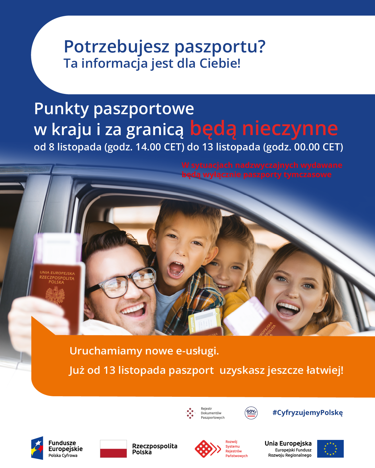 W związku z trwającymi przygotowaniami do uruchomienia nowego Rejestru Dokumentów Paszportowych, od 8 listopada (od godz. 14.00) do 13 listopada br. punkty paszportowe nie będą przyjmować wniosków i nie będzie możliwości odbioru dokumentu. Prace wdrożeniowe spowodują również ograniczenia w dostępności usługi paszportowej w dniach 7 listopada i 8 listopada br. Jednocześnie zwracamy się z prośbą o zaplanowanie wizyty w punkcie 8 listopada br. do godz. 13:00, aby obsługa wszystkich klientów została zrealizowana do godz. 14:00. W sytuacjach nadzwyczajnych wydawane będą wyłącznie paszporty tymczasowe.