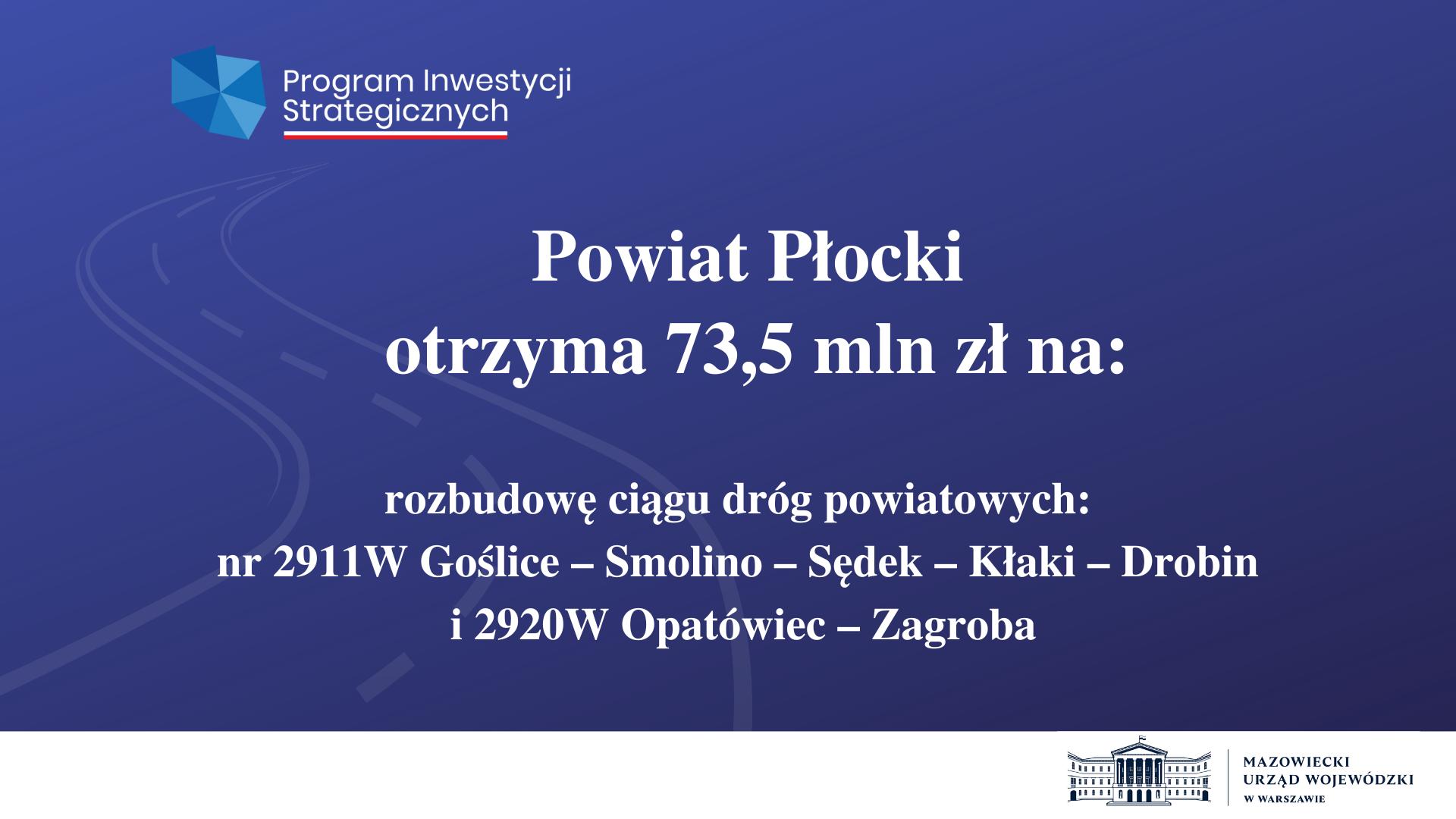- Powiat Płocki – 73,5 mln zł na rozbudowę ciągu dróg powiatowych: nr 2911W Goślice – Smolino – Sędek – Kłaki – Drobin i 2920W Opatówiec – Zagroba.