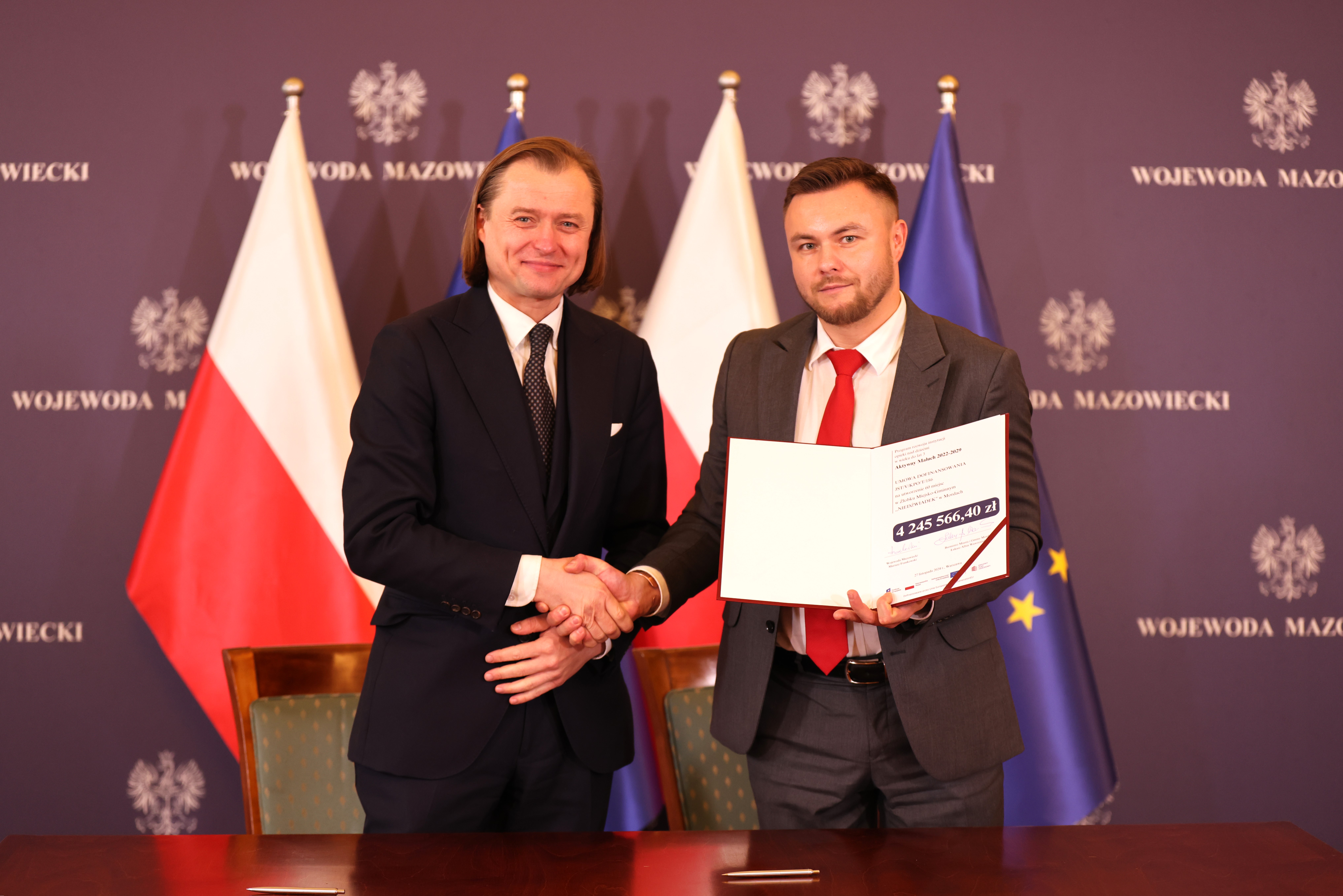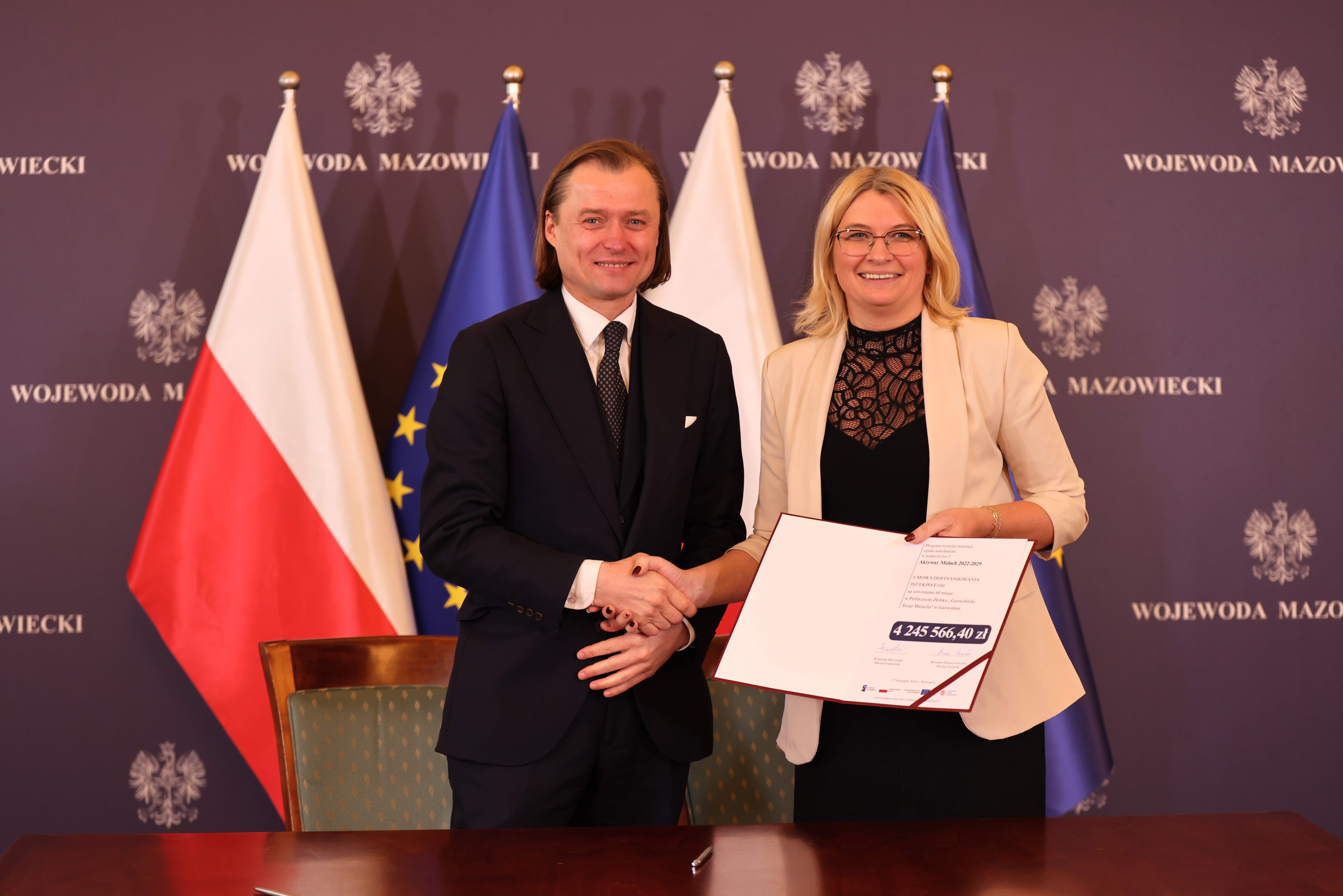 - Gmina Stara Biała – umowa na kwotę 7 075 944,00 zł na utworzenie 100 miejsc w Żłobku Gminnym w Maszewie Dużym.