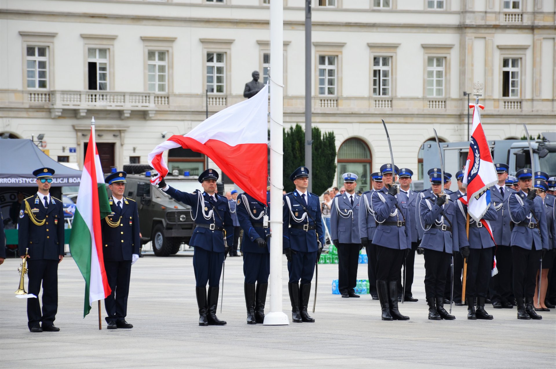 Centralne obchody Święta Policji odbyły się o godzinie 14.00 na Placu im. Marszałka Józefa Piłsudskiego w Warszawie. Wydarzenie miało uroczystą oprawę - rozpoczęło się od wmaszerowania na plac policyjnych pododdziałów oraz złożenia meldunków przez dowódcę uroczystości gen. Insp. Jarosławowi Szymczykowi, Komendantowi Głównemu Policji. Następnie, po wciągnięciu na maszt flagi państwowej oraz wspólnym odśpiewaniu hymnu przez uczestników uroczystości Komendant Główny Policji powitał przybyłych gości.\