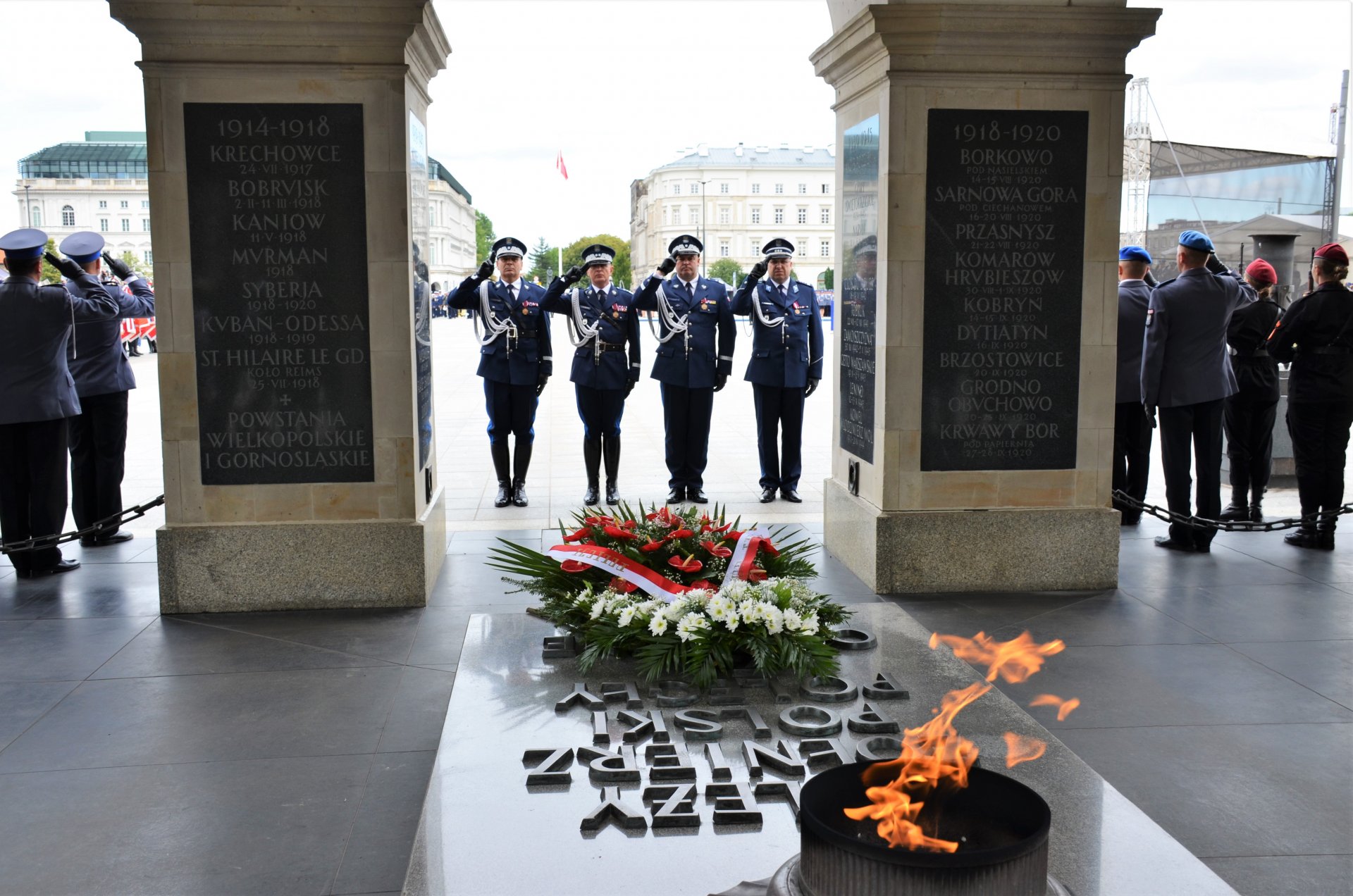 Następnie przed Grobem Nieznanego Żołnierza złożony został wieniec. Na zakończenie odbyła się uroczysta defilada policyjnych pododdziałów.