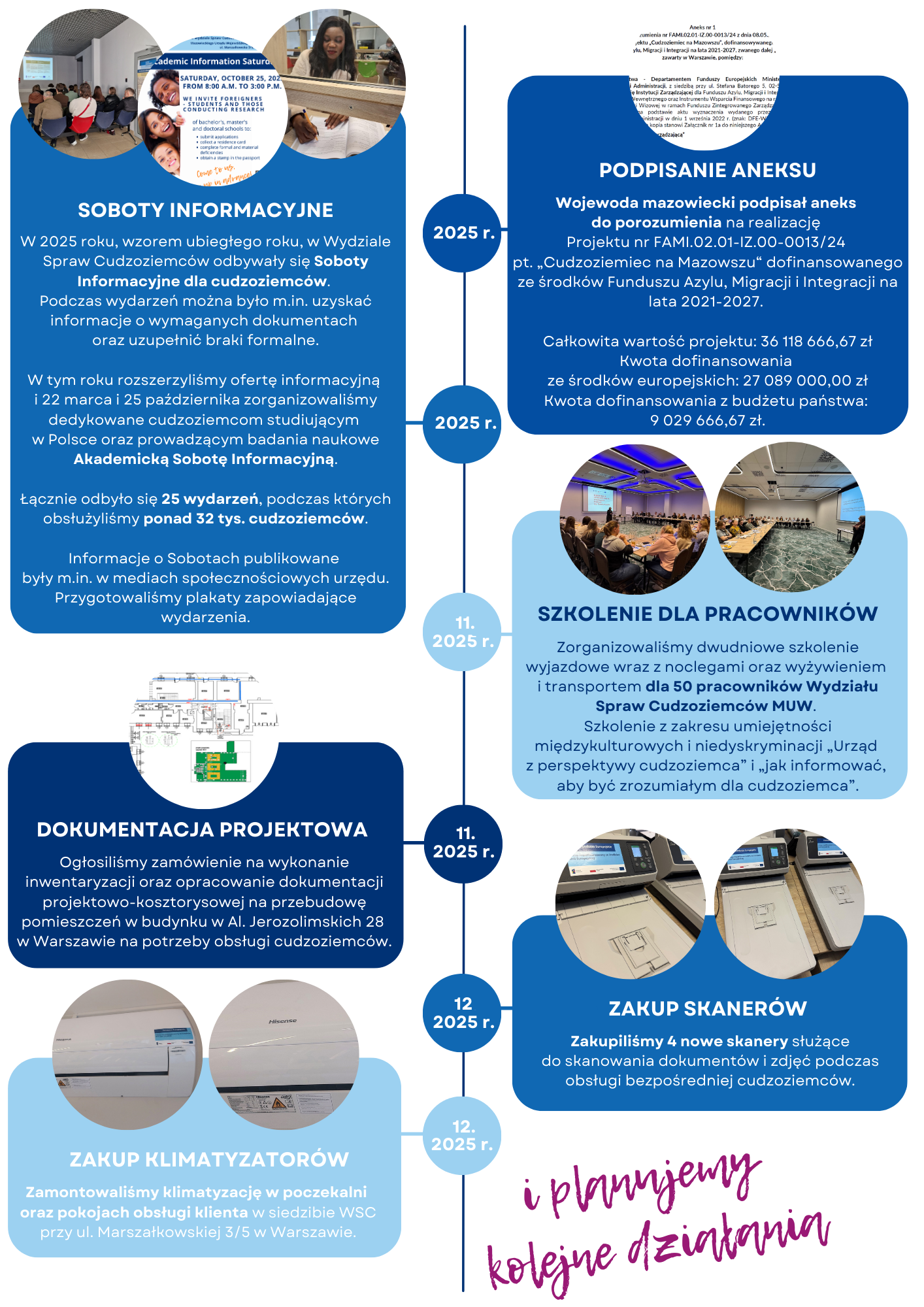 - zapewnienie ciągłości funkcjonowania nowoczesnej infolinii Migrant Contact Center poprzez zatrudnienie 10 konsultantów do udzielania informacji OPT oraz organizację Sobót Informacyjnych.