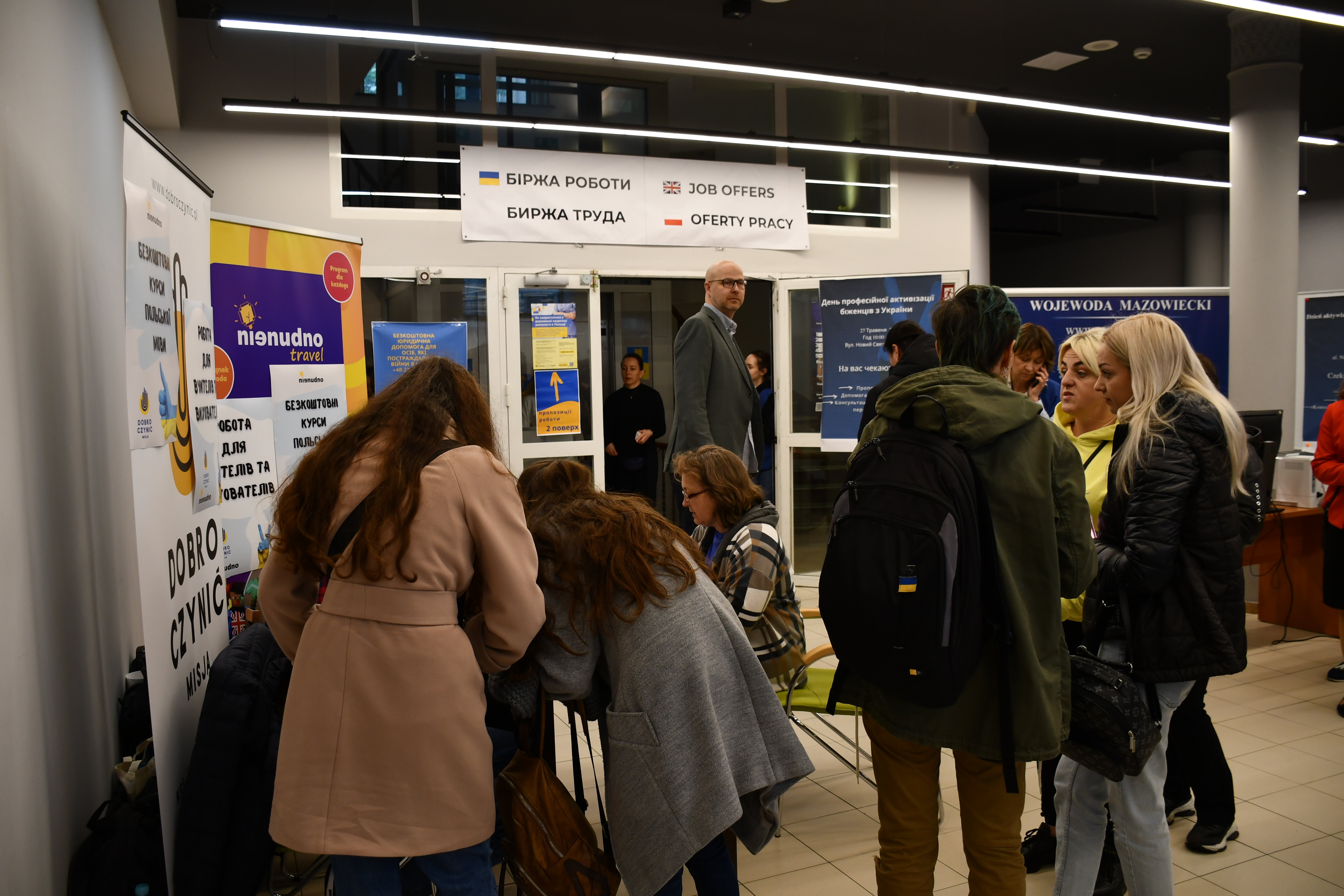 Mazowiecki Urząd Wojewódzki w Warszawie 27 maja br. zorganizował dzień aktywizacji zawodowej dla uchodźców z Ukrainy, w którym wzięły udział 533 osoby. Wydarzenie odbyło się w Punkcie Pomocy Humanitarnej (ul. Nowy Świat 15/17, II piętro), prowadzonym przez Wojewodę Mazowieckiego. Podczas dnia aktywizacji zawodowej uchodźcy z Ukrainy mogli m. in. zapoznać się z ofertami pracy, porozmawiać z pracodawcami, uzyskać pomoc w pisaniu CV oraz otrzymać informacje na temat legalizacji pobytu w Polsce. Wydarzeniu towarzyszył briefing prasowy, dotyczący aktywizacji zawodowej uchodźców z Ukrainy na mazowieckim rynku pracy, w którym wziął udział Wicewojewoda Mazowiecki Artur Standowicz.