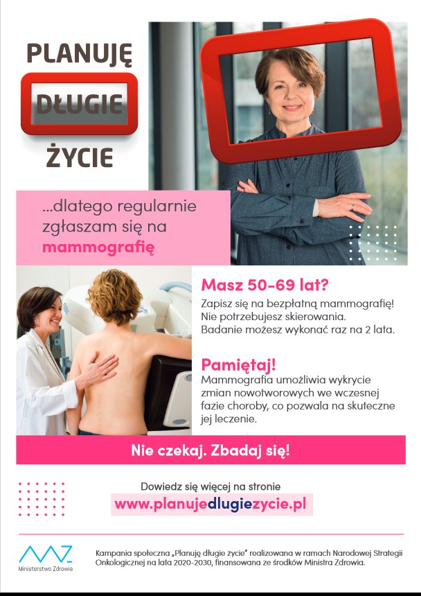 Kobiety w wieku 50-69 lat, mogą zapisać się na bezpłatną mammografię na którą nie potrzebują skierowania. Badanie można wykonać raz na 2 lata.