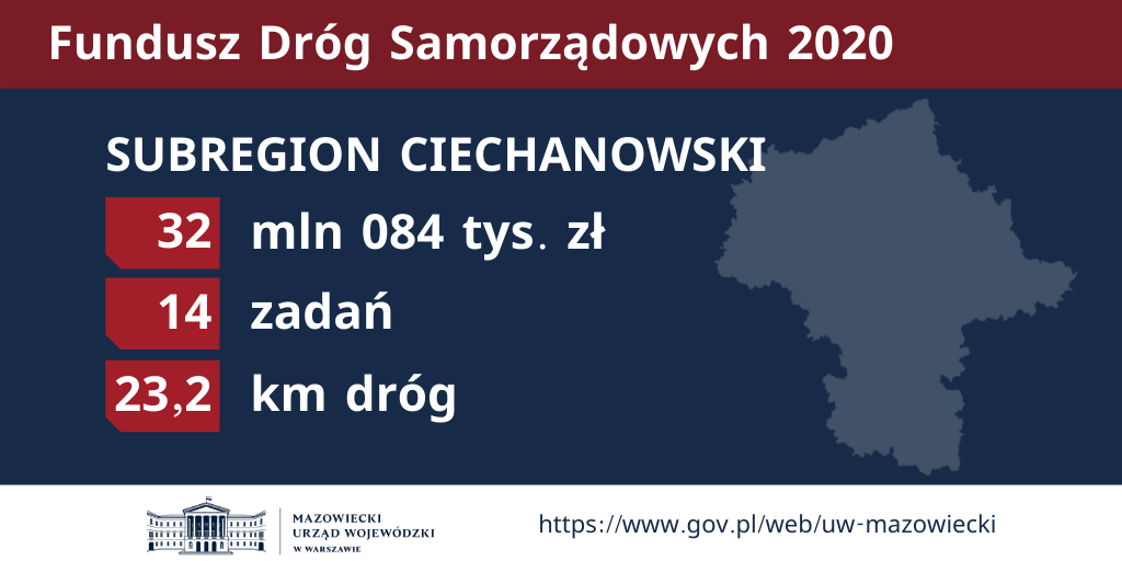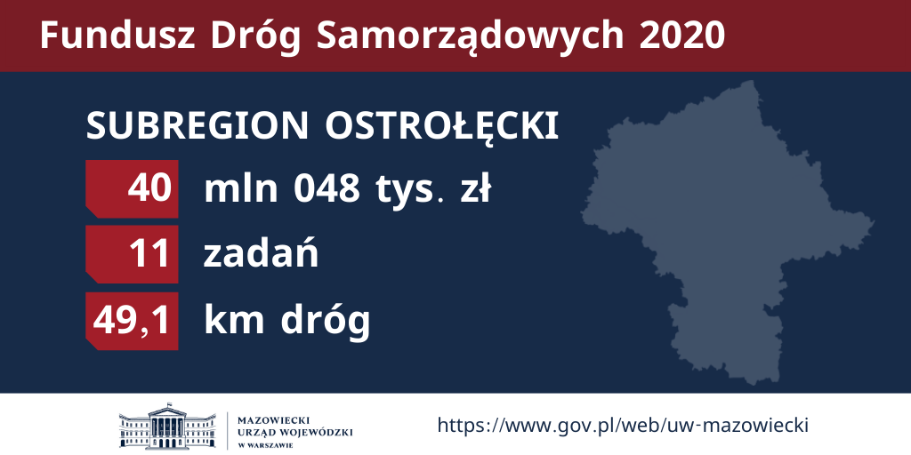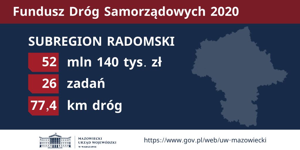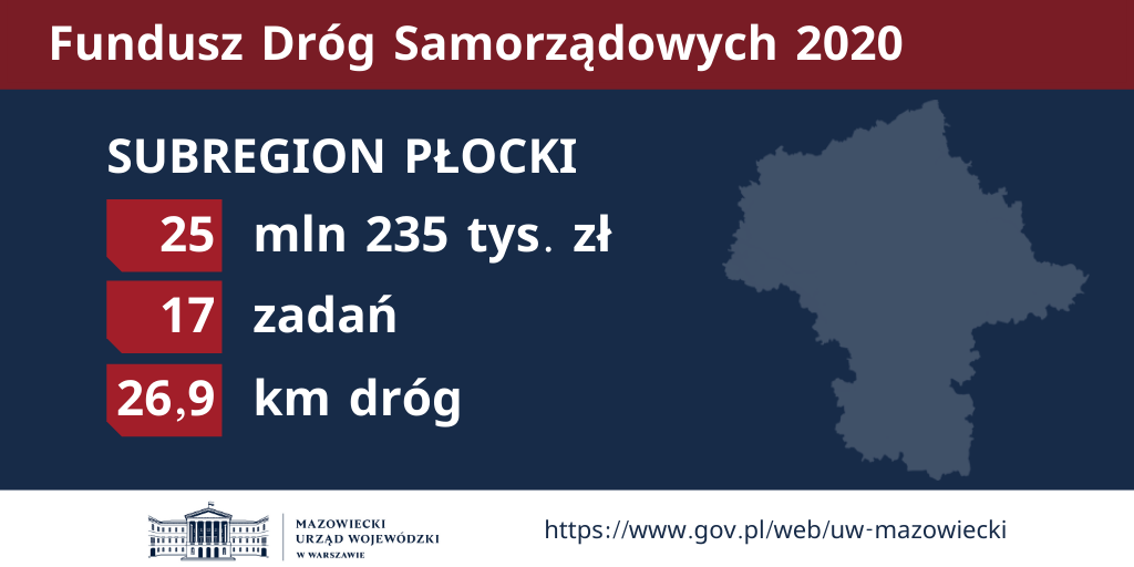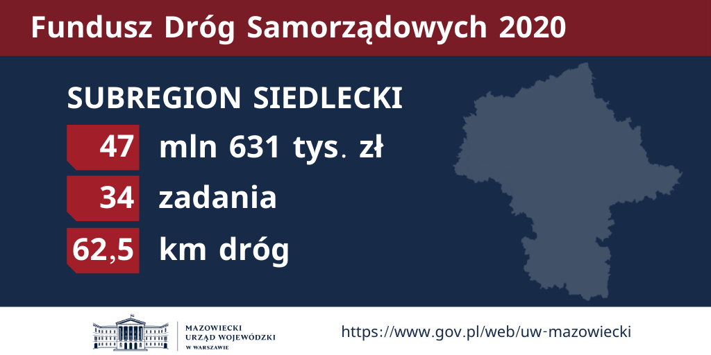 W ramach naboru wniosków do dofinansowania zadań ze środków Funduszu Dróg Samorządowych na 2020 rok, wsparcie uzyska 138 mazowieckich zadań (47 powiatowych i 91 gminnych), co pozwoli na budowę, przebudowę lub remont 298 kilometrów dróg: 162 km powiatowych i 135 km gminnych. Ustalony dla województwa mazowieckiego limit na dofinansowanie zadań realizowanych przez samorządy wyniesie 306,1 mln zł (162,6 mln zł na zadania powiatowe, 143,5 mln zł na zadania gminne).