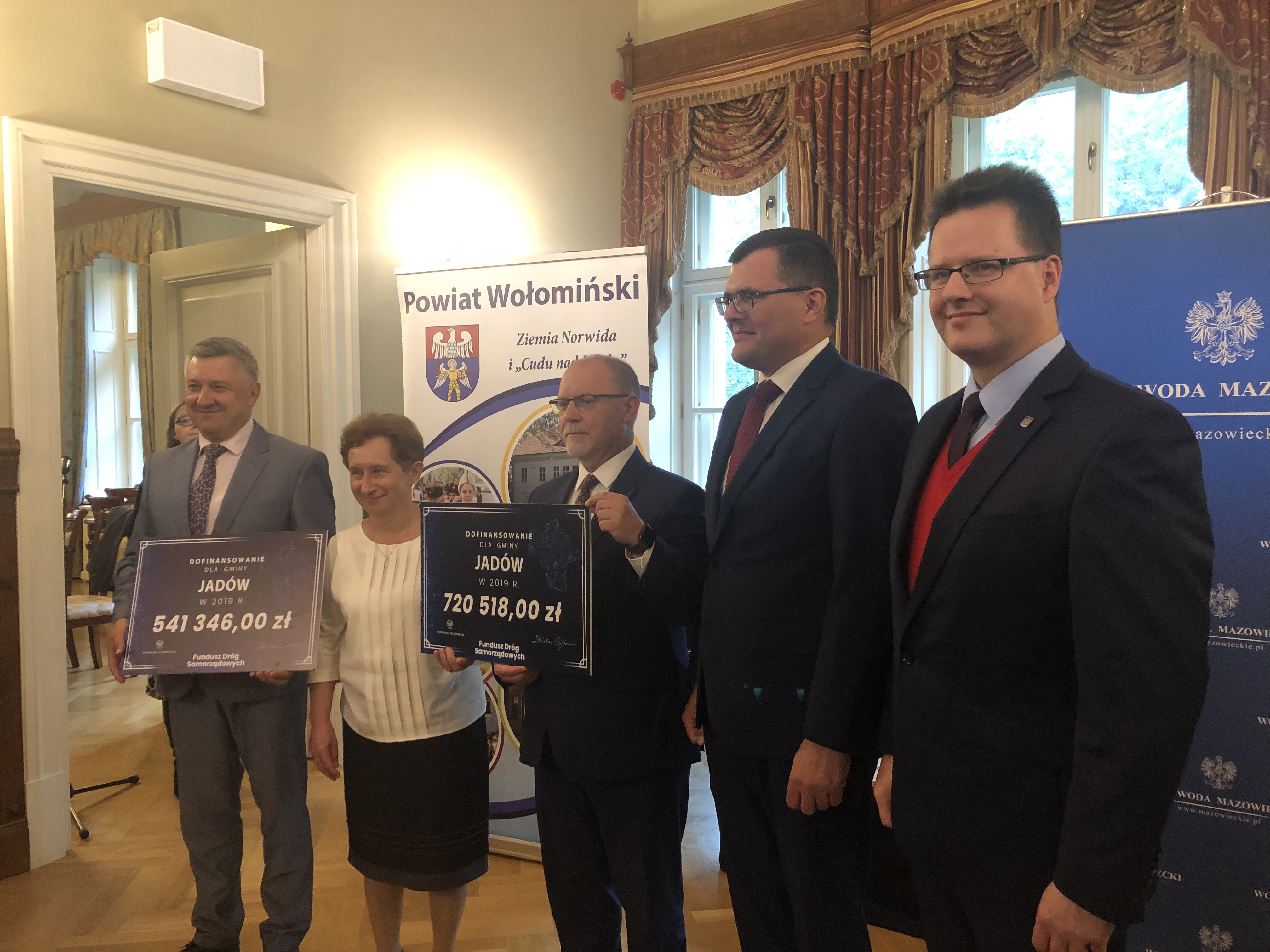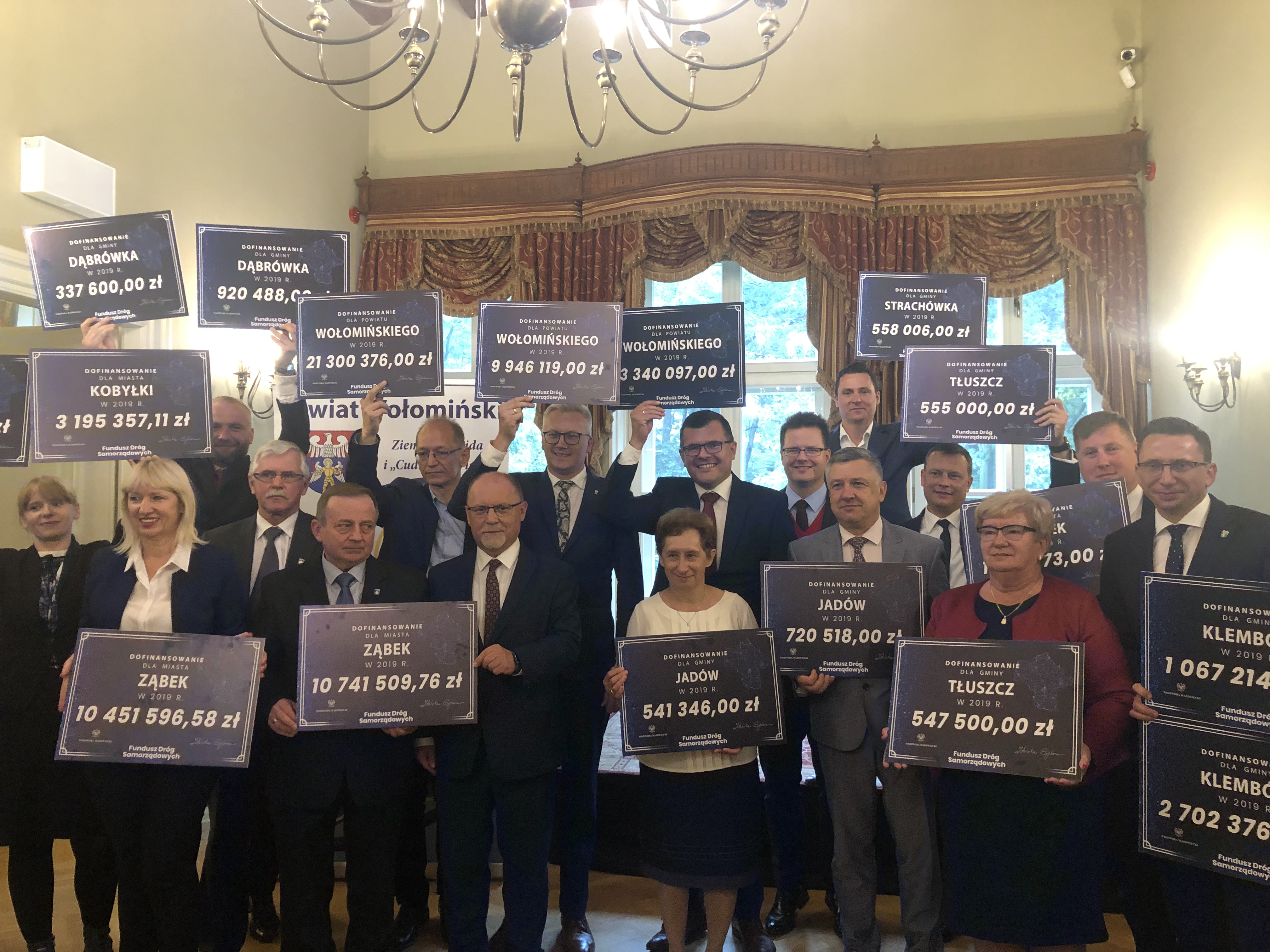 Dofinansowanie w wysokości 144 mln zł z Funduszu Dróg Samorządowych otrzymają samorządy regionu okołowarszawskiego. Wsparcie dotyczy budowy, remontu lub przebudowy 10 dróg powiatowych i 34 dróg gminnych o łącznej długości prawie 68 km*. W czwartek 26 września br. Wojewoda Zdzisław Sipiera przekazał czeki na dofinansowanie zadań z programu przedstawicielom samorządów. Odebrały je następujące powiaty: otwocki oraz wołomiński, a także gminy miejskie oraz wiejskie: Józefów, Karczew, Otwock, Wiązowna, Góra Kalwaria, Dąbrówka, Jadów, Klembów, Kobyłka, Marki, Strachówka, Tłuszcz, Ząbki. W spotkaniu uczestniczyli także Posłowie na Sejm RP Anita Czerwińska i Piotr Uściński.