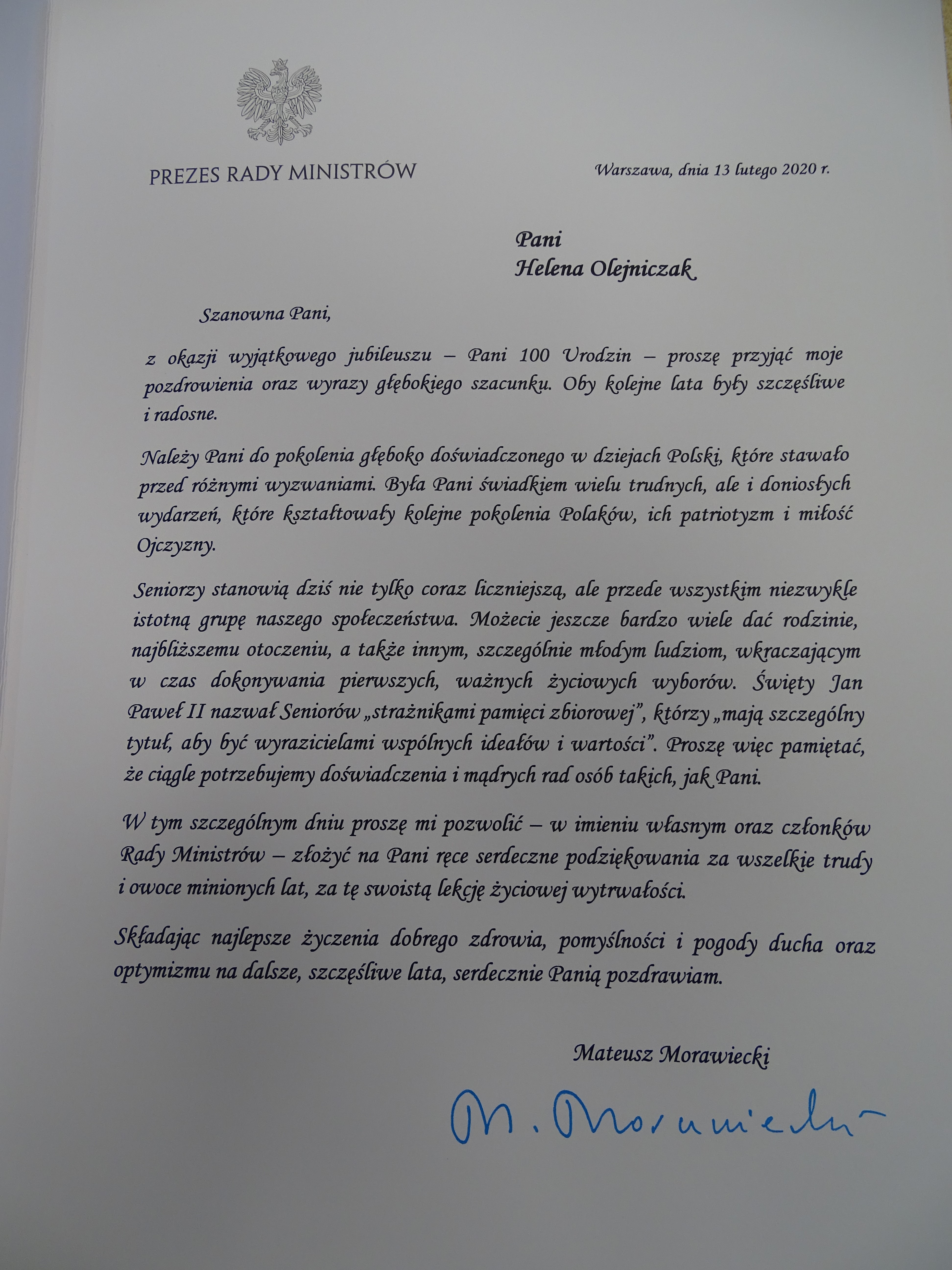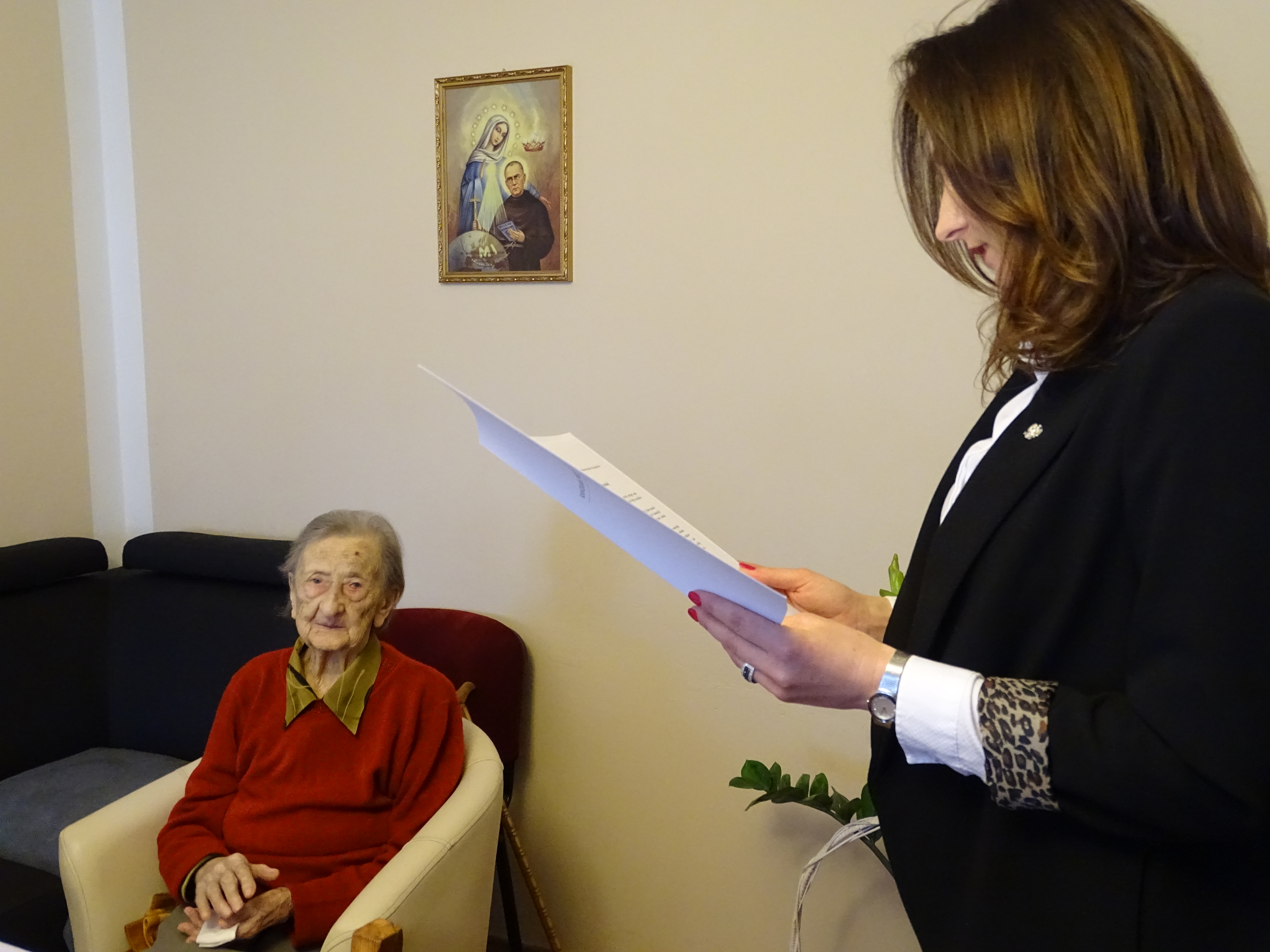 13 lutego br. Pani Helena obchodziła swoje setne urodziny. List gratulacyjny od Prezesa Rady Ministrów Mateusza Morawieckiego i życzenia oraz kwiaty od Wojewody Mazowieckiego Konstantego Radziwiłła przekazała Marlena Mazurska Kierownik Delegatury MUW w Płocku.