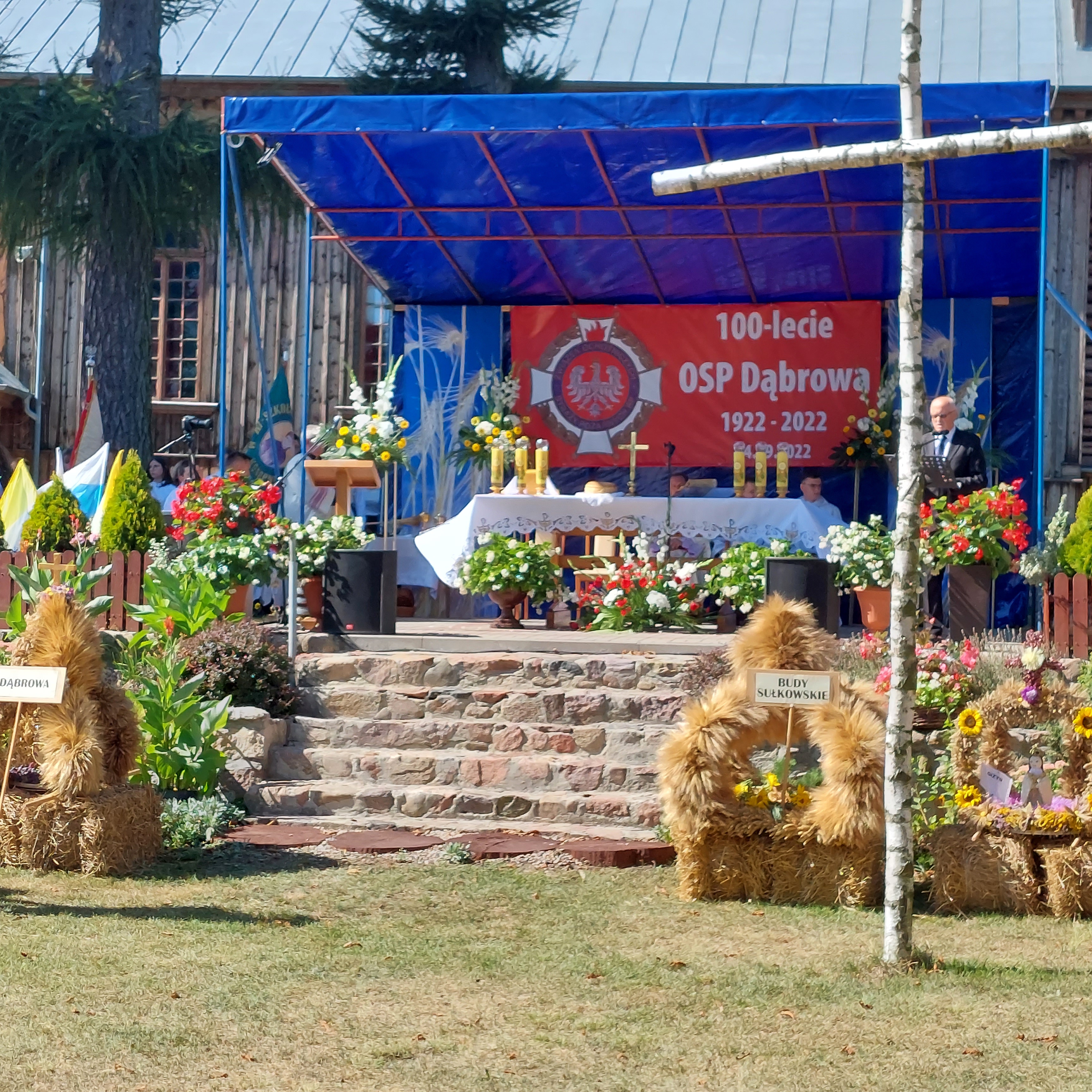 W Dąbrowie przed strażnica OSP zebrały się pododdziały, poczty sztandarowe i delegacje z wieńcami dożynkowymi. Pamiątkowa tablica z okazji 100–lecia OSP w Dąbrowie została wmurowana w ścianę i poświęcona przez kanclerza Kurii Diecezjalnej Płockiej ks. Dr. Piotra Grzywaczewskiego.