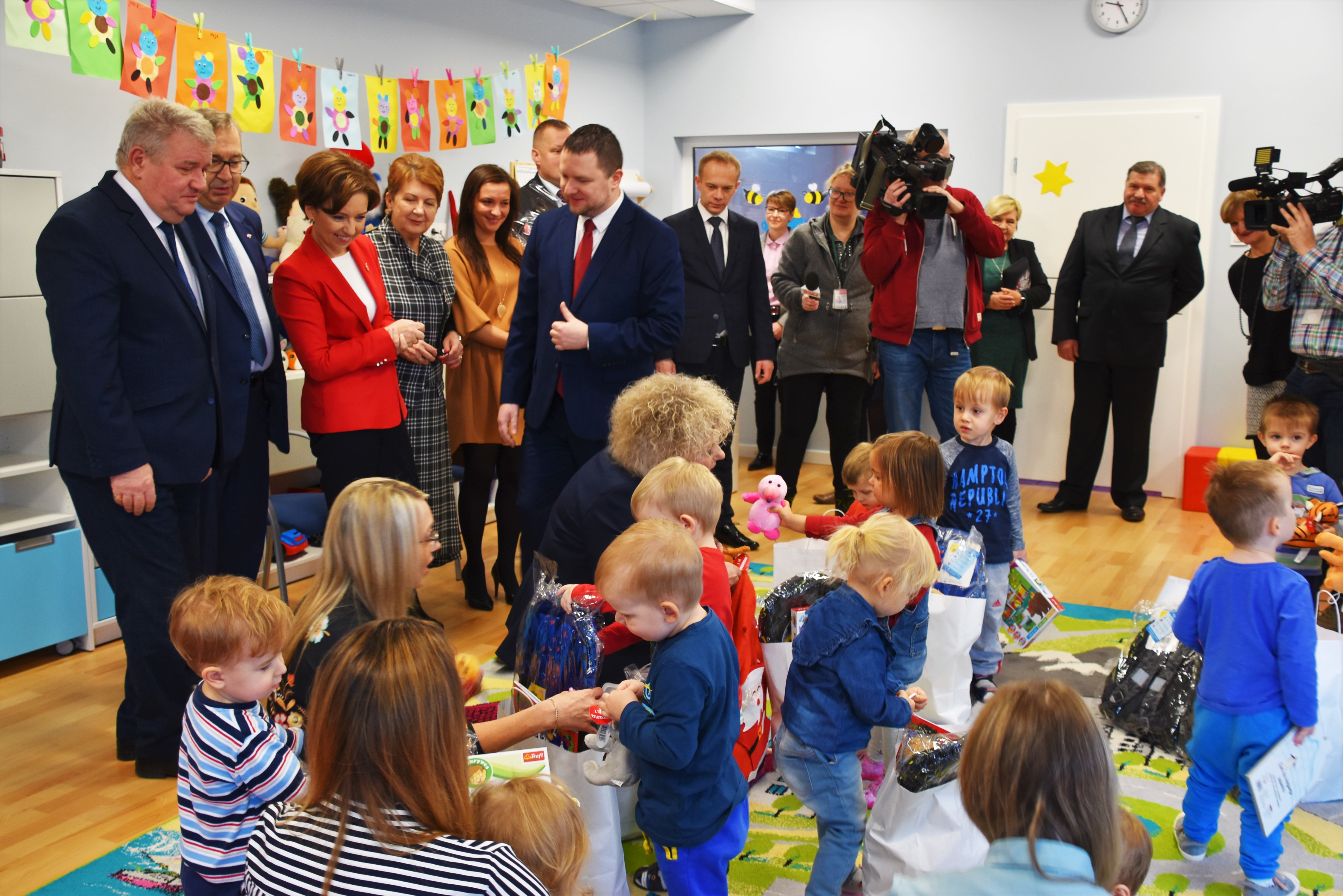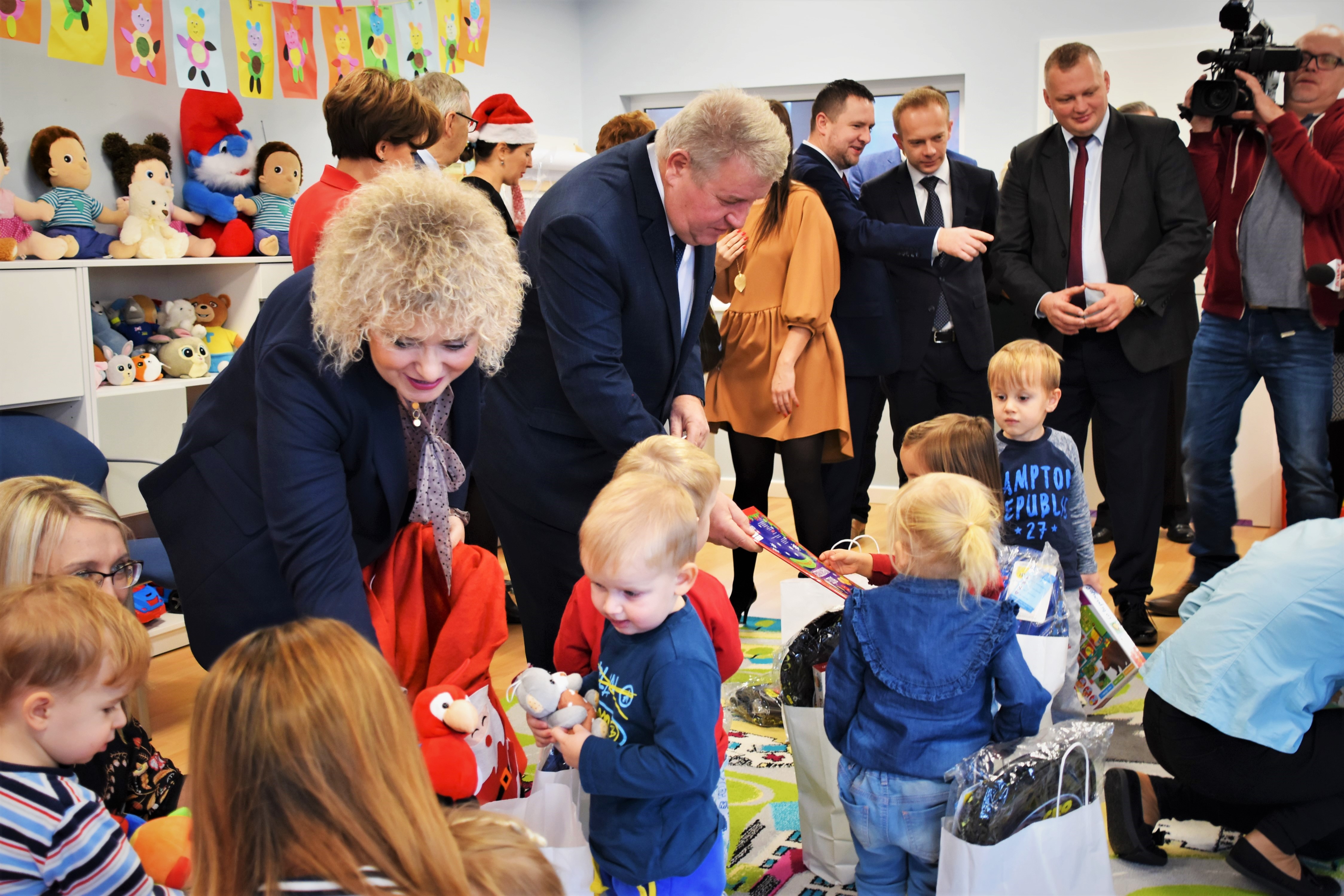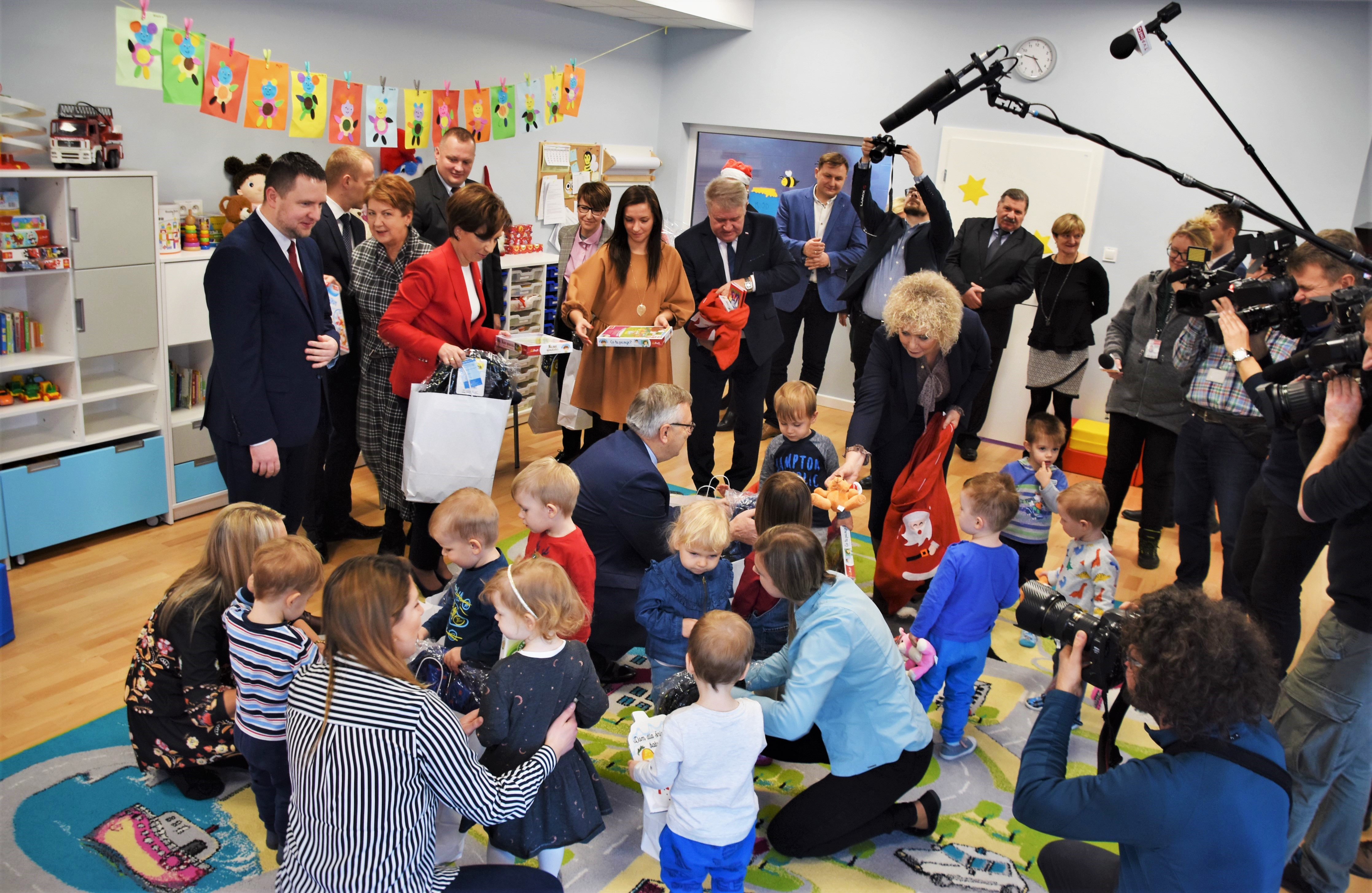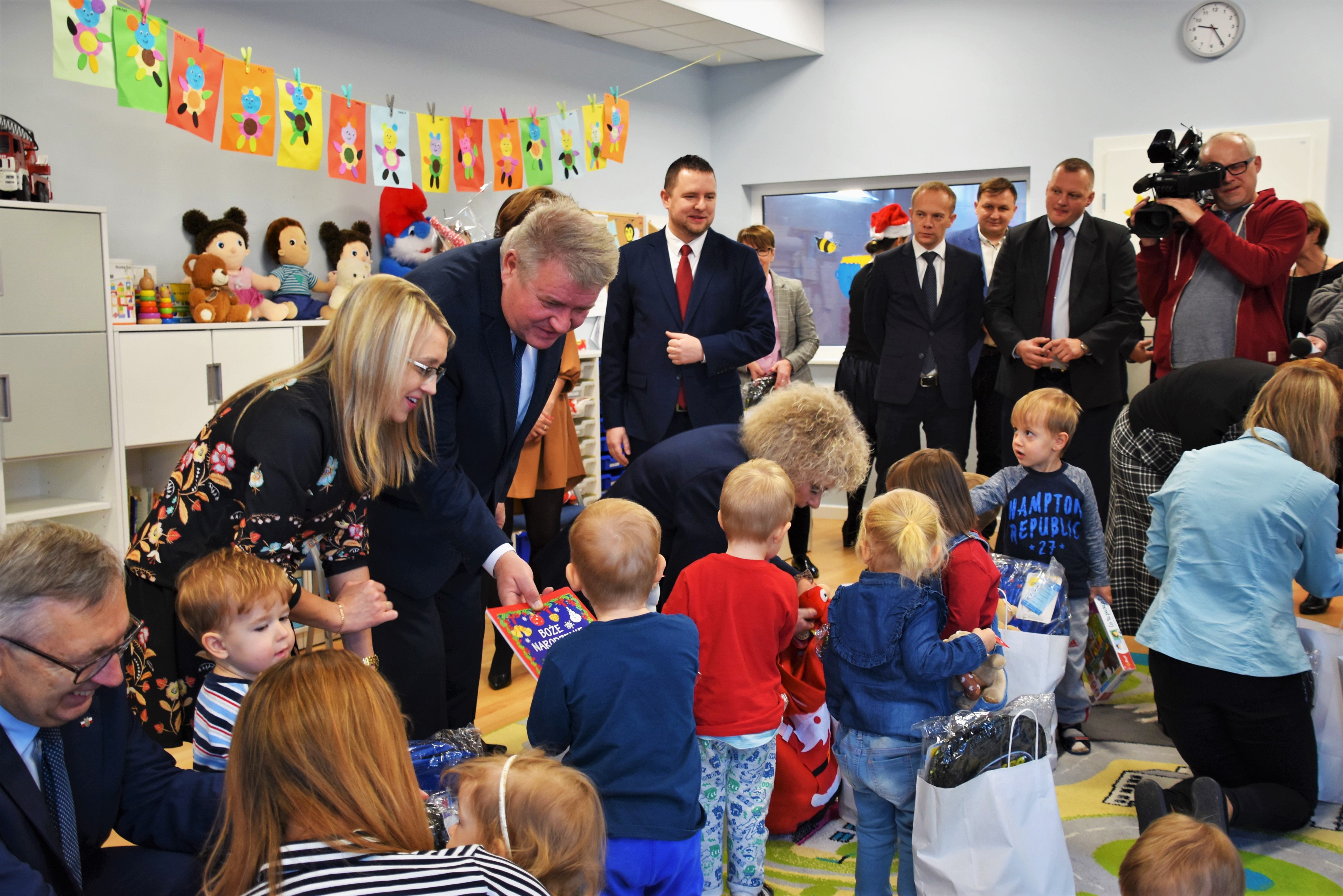 Zaproszeni goście po zwiedzaniu placówki, spotkali się z wychowankami najstarszej grupy „Pszczółek”, podczas którego Minister Rodziny Pracy i Polityki Społecznej Marlena Maląg, Wiceminister Stanisław Szwed oraz Wicewojewoda Sylwester Dąbrowski wręczyli prezenty podopiecznym.