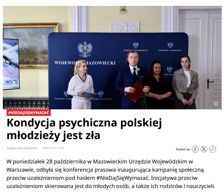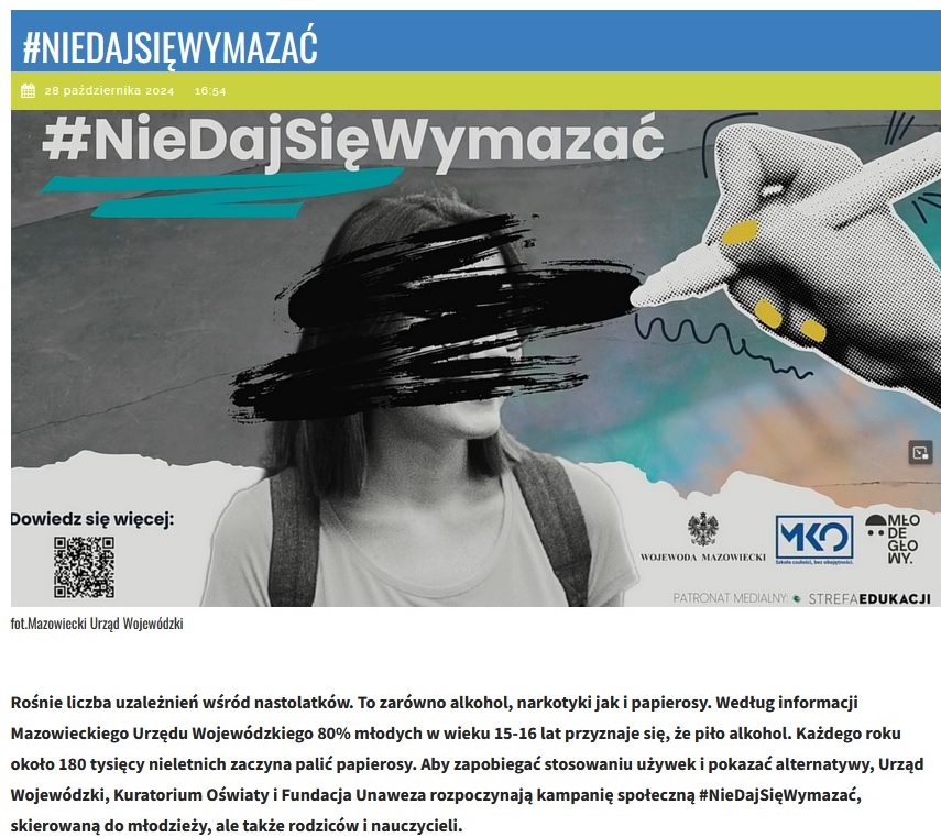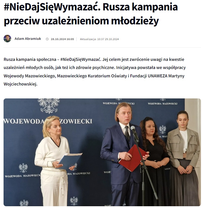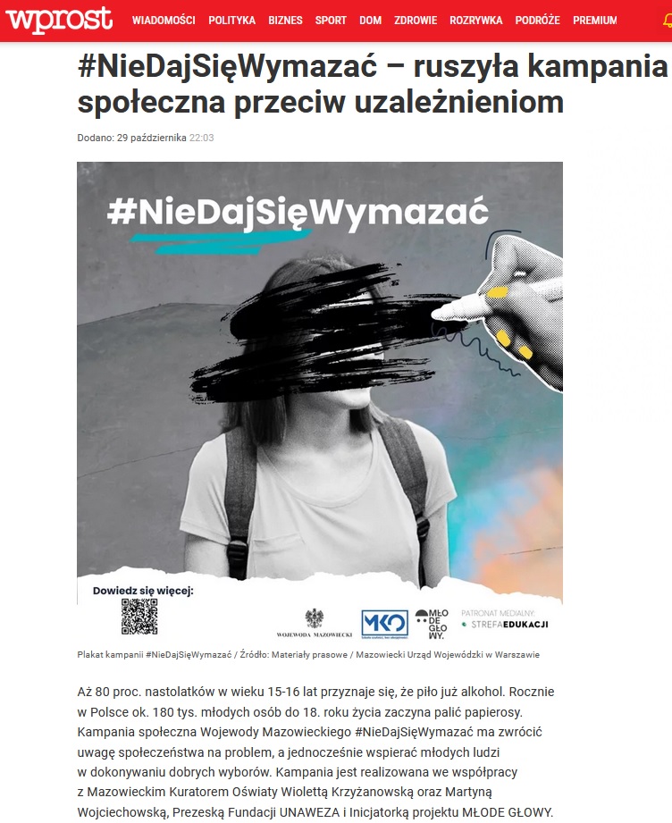 29/10/2024 Wprost: #NieDajSięWymazać – ruszyła kampania społeczna przeciw uzależnieniom. Artykuł do przeczytania TUTAJ.