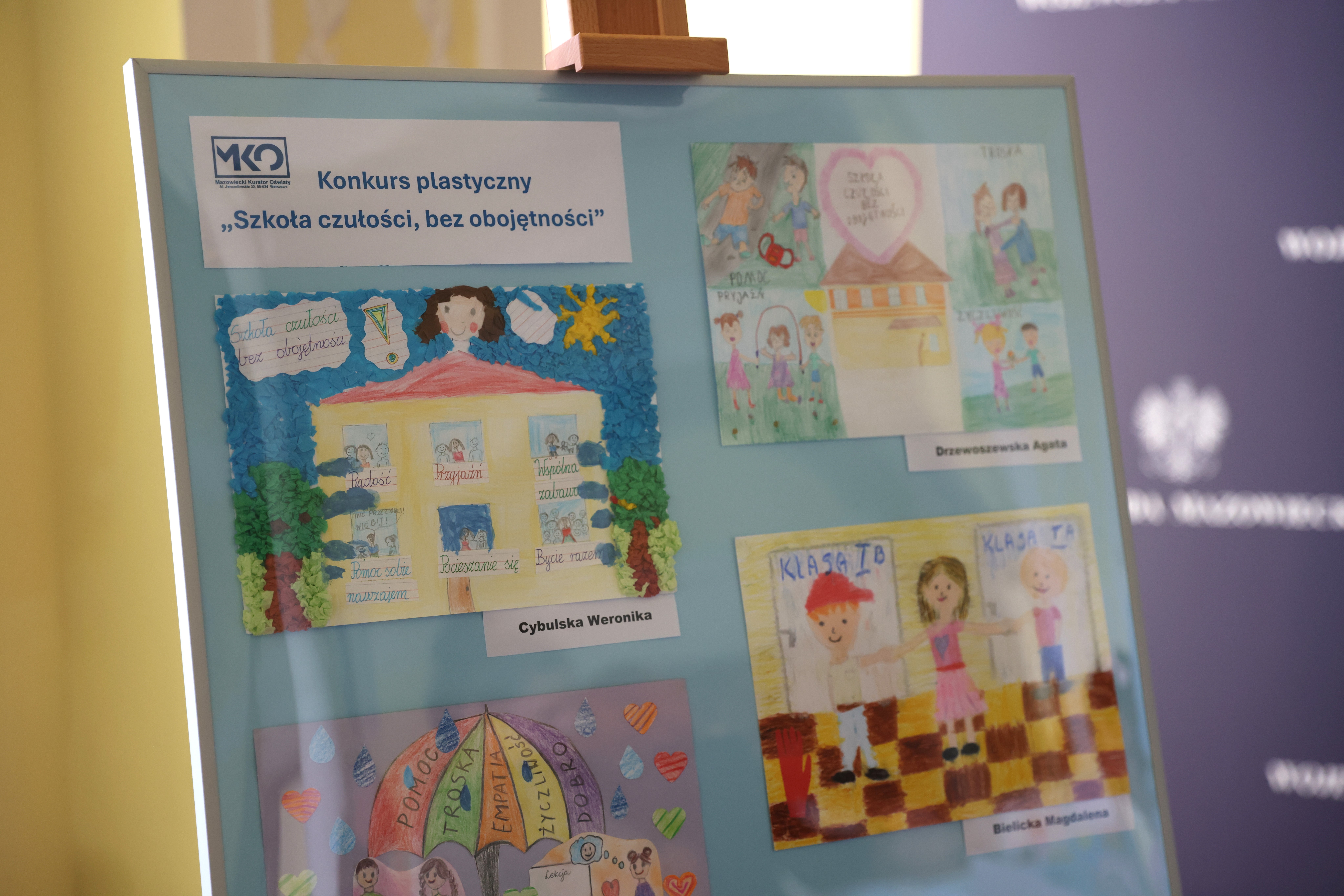 Konkurs plastyczny „Szkoła czułości, bez obojętności” skierowany był do uczniów klas I-III szkół podstawowych oraz przedszkolaków z województwa mazowieckiego. Uczestnicy mieli za zadanie wykonać indywidualną pracę plastyczną inspirowaną tematem „Szkoła czułości, bez obojętności”, poczuciem bezpieczeństwa, dobrym samopoczuciem w szkole lub w przedszkolu oraz wartościami takimi jak: godność, odpowiedzialność, przyjaźń, uczciwość i pomoc.