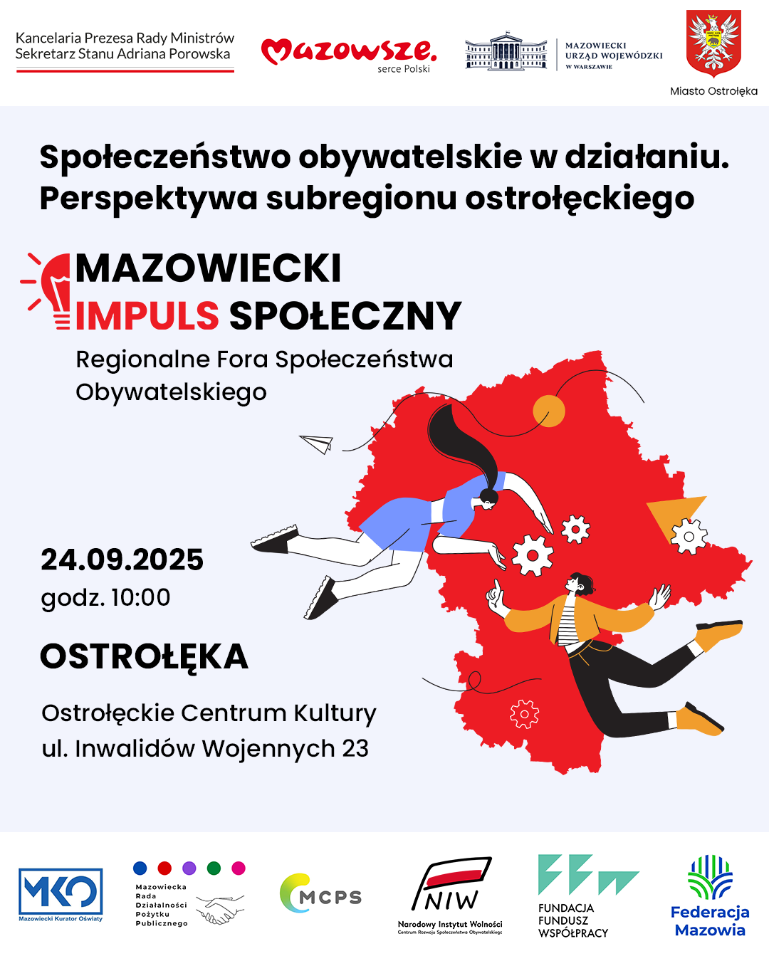 Współorganizatorzy Mazowieckiego Impulsu Społecznego: Kancelaria Prezesa Rady Ministrów, Mazowiecki Urząd Wojewódzki oraz Samorząd Województwa Mazowieckiego.