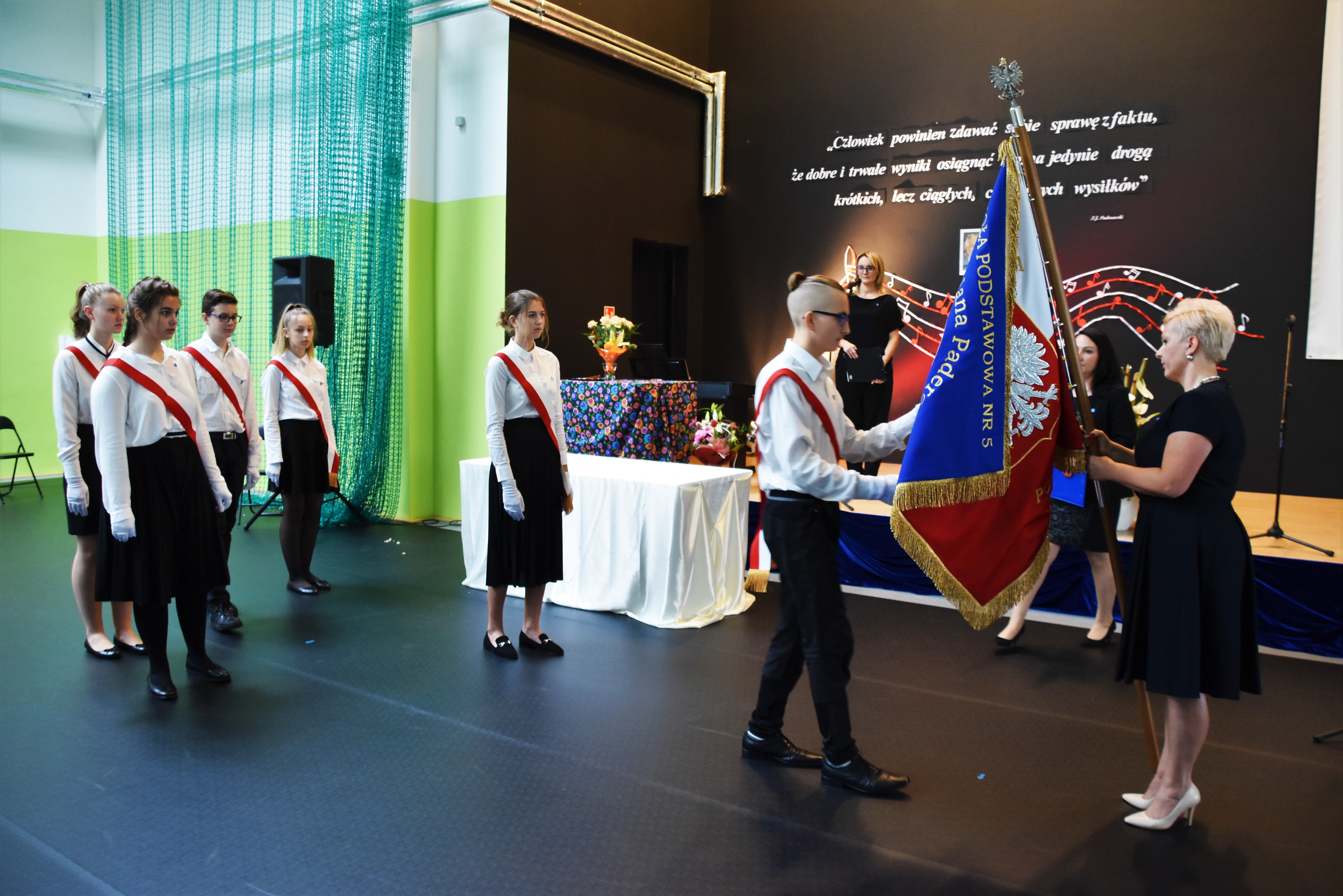 „Czym flaga dla kraju, tym sztandar dla szkoły”. Dlatego też w kolejnej części uroczystości Rada Rodziców Szkoły Podstawowej nr 5 w Pruszkowie przekazała sztandar dyrektorowi tej placówki, Pani Anecie Pawłowskiej. Wcześniej fundatorzy sztandaru wbili w jego drzewce pamiątkowe gwoździe. Zwyczaj ten jest symbolem szacunku i uznania.