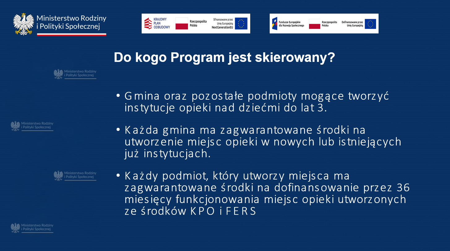 Środki w ramach Programu MALUCH+ 2022–2029 przeznaczone są w pierwszej kolejności dla gmin. Każda gmina ma zagwarantowane środki na utworzenie miejsc opieki w nowych lub istniejących już instytucjach oraz środki na dofinansowanie przez 36 miesięcy funkcjonowania utworzonych miejsc opieki.