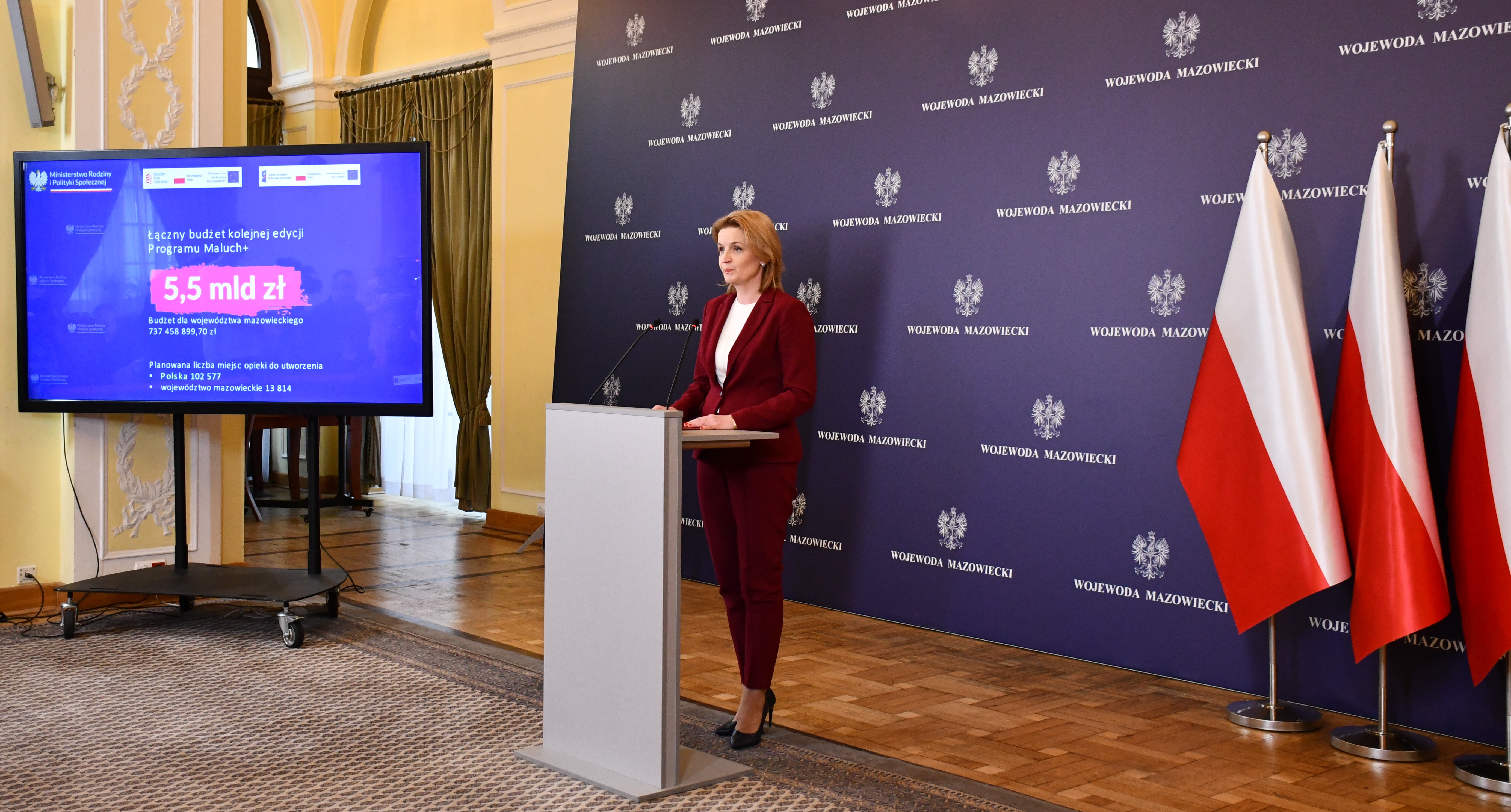 Podsekretarz Stanu w Ministerstwie Rodziny i Polityki Społecznej, Pełnomocnik Rządu do Spraw Polityki Demograficznej Barbara Socha oraz Wicewojewoda Mazowiecki Sylwester Dąbrowski podczas konferencji prasowej przedstawili założenia nowej odsłony programu Maluch+. Budżet kolejnej edycji zaplanowano na 5,5 mld zł. Dzięki temu liczba miejsc dla najmłodszych dzieci zwiększy się w kraju o dodatkowe 102 tys. miejsc. Budżet dla województwa mazowieckiego wyniesie ponad 737 mln zł, co pozwoli na utworzenie ponad 13,8 tys. miejsc opieki. Wnioski można składać wyłącznie drogą elektroniczną do 19 lutego br. Wydarzenie odbyło się w piątek, 20 stycznia br. w Mazowieckim Urzędzie Wojewódzkim w Warszawie.