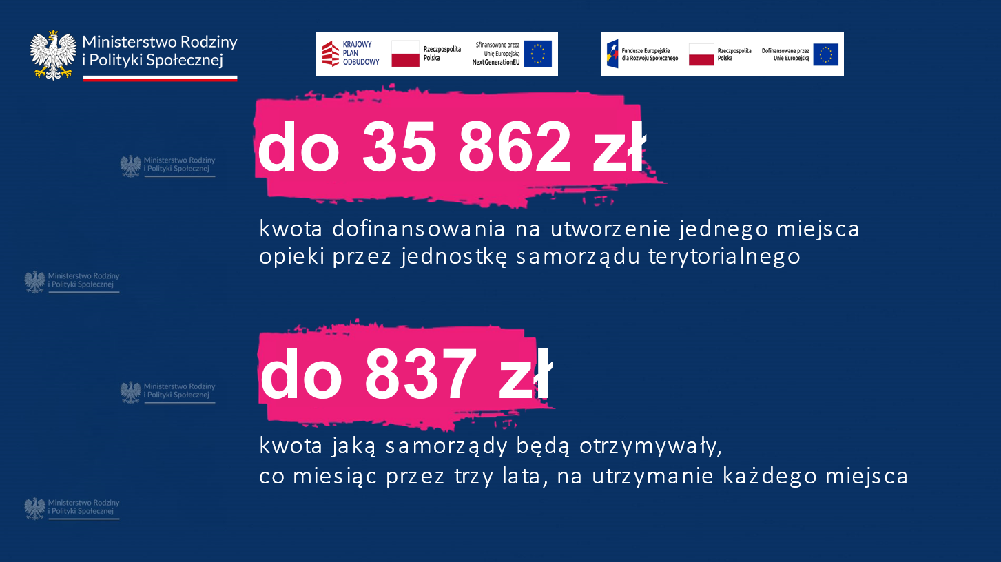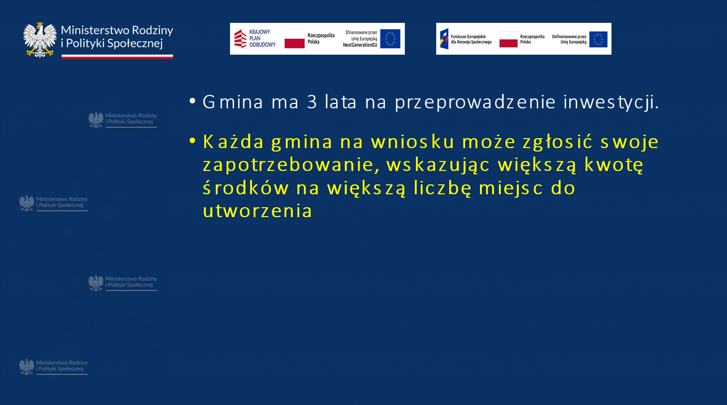 W nowej edycji programu gminy będą miały trzy lata na realizację zadania od ostatniego dnia na złożenie oświadczenia o przyjęciu środków dofinansowania. Pieniądze będzie można przeznaczyć nie tylko na przebudowę, remont budynku lub dostosowanie pomieszczeń do potrzeb dzieci, ale także na zakup lub montaż wyposażenia. Samorządy mogą otrzymać do 35 862 zł (bez VAT) dofinansowania na utworzenie jednego miejsca opieki oraz do 837 zł co miesiąc przez trzy lata, na utrzymanie każdego miejsca.