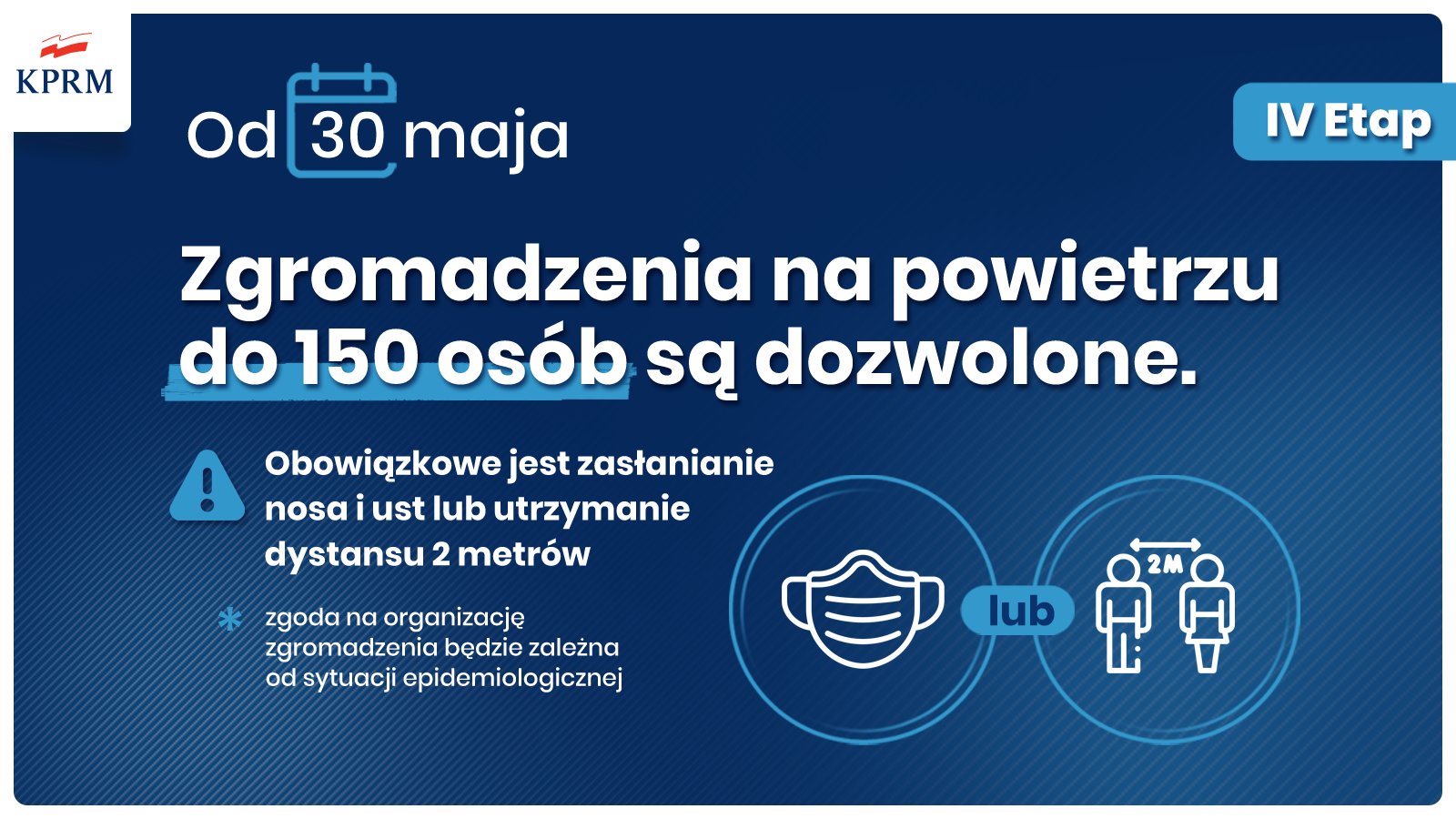 Od soboty 30 maja w przestrzeniach otwartych dozwolona jest organizacja zgromadzeń, w których bierze udział do 150 osób. Uczestnicy muszą jednak zasłaniać usta i nos lub zachować 2-metrowy dystans społeczny.