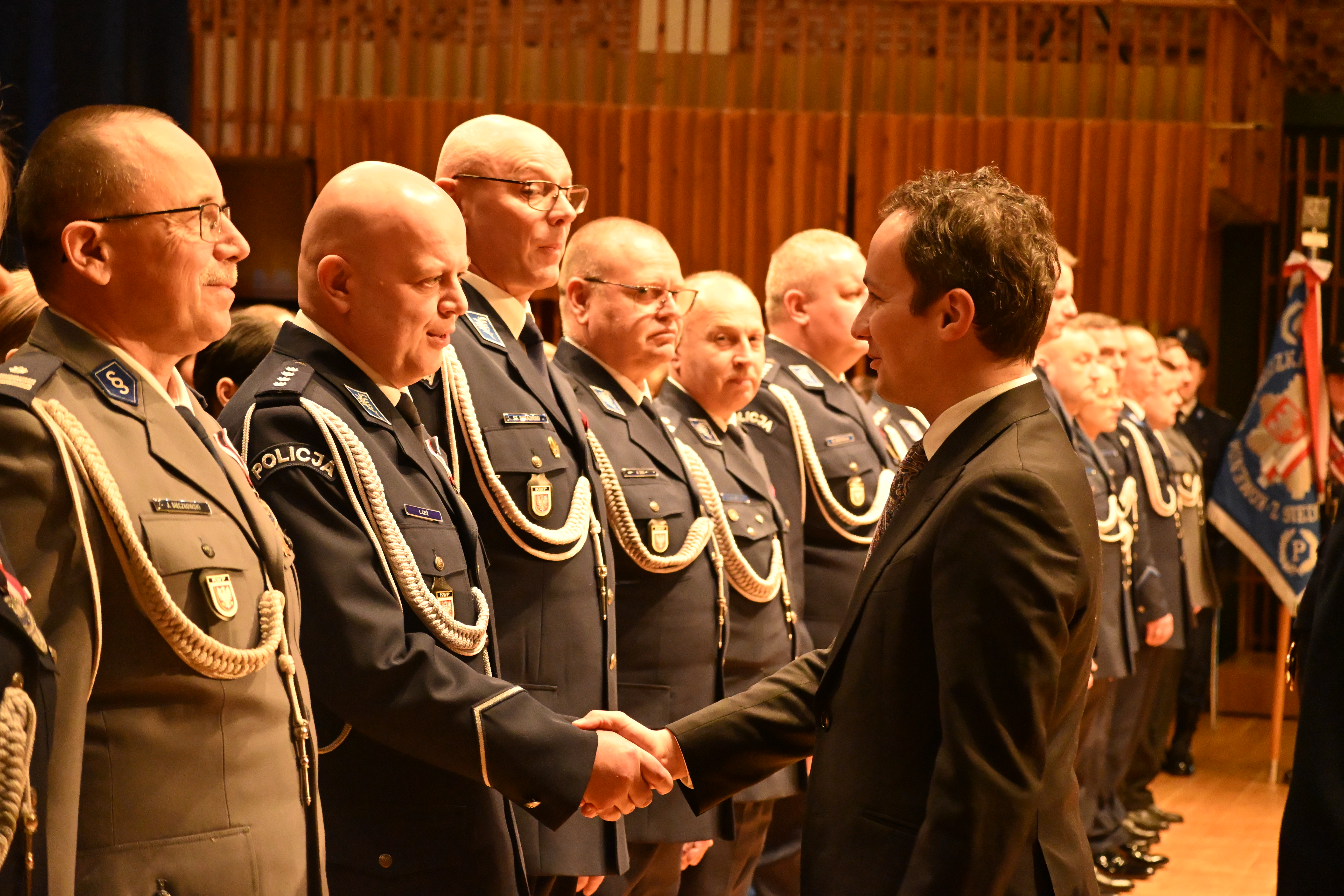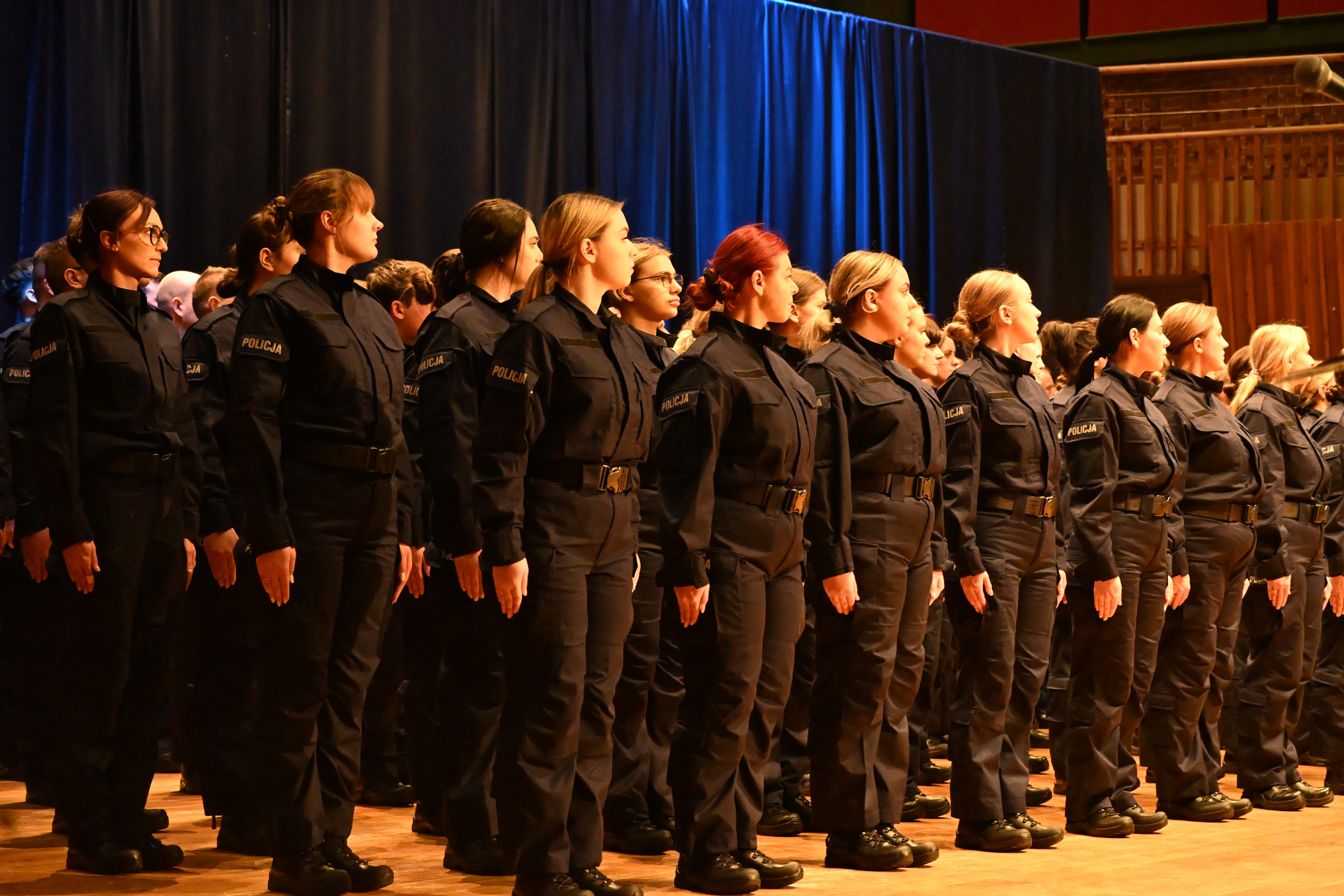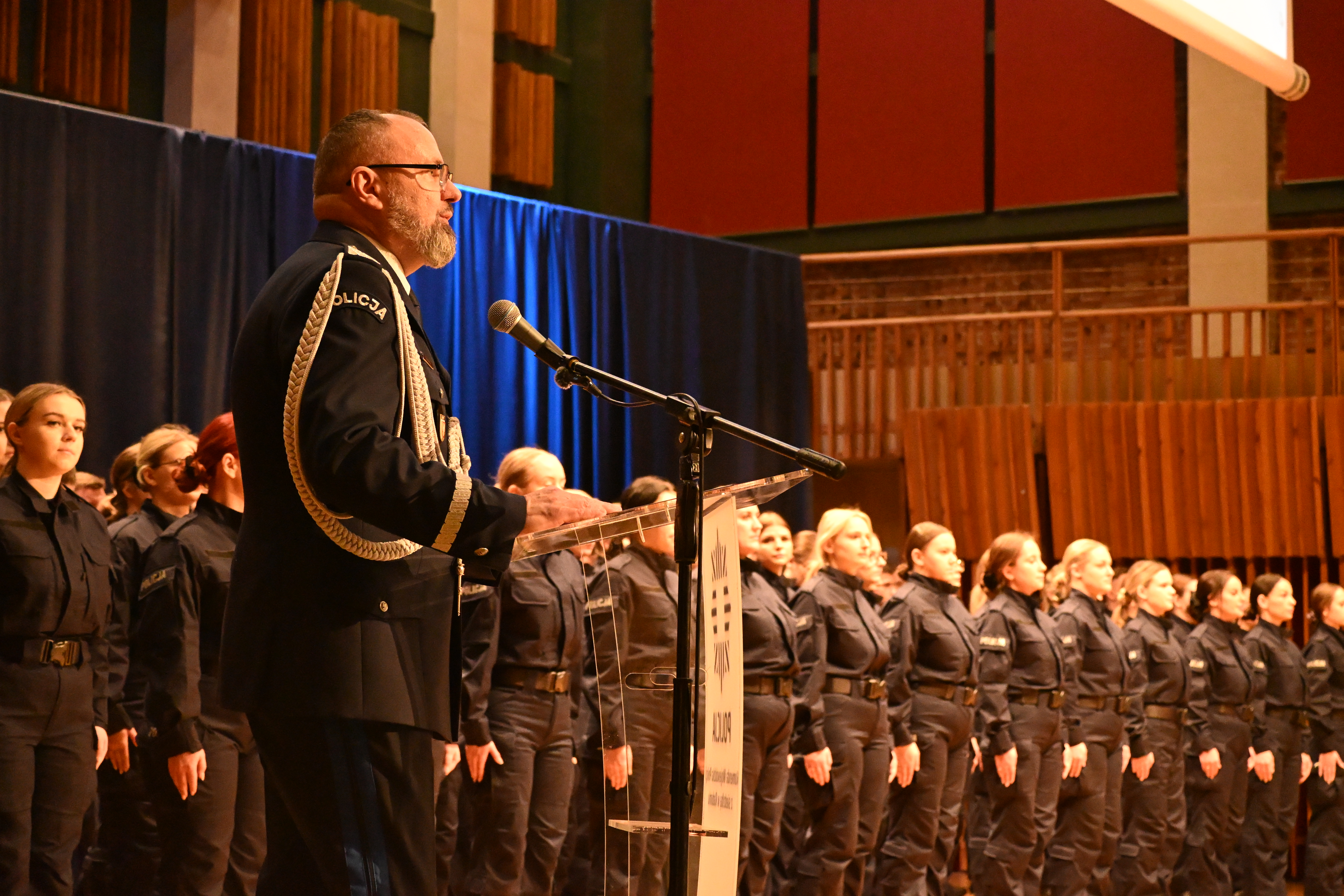 Dzisiejsza uroczystość to dwa ważne wydarzenia. Z jednej strony uhonorowaliśmy za nienaganną służbę ojczyźnie wielu policjantów, za co Wam serdecznie dziękuję. Z drugiej przyjmujemy w szeregi nowych funkcjonariuszy i nowe funkcjonariuszki. Zarówno jednej, jak i drugiej grupie należą się dzisiaj ukłony, słowa gratulacji i podziękowań, bo to Wy wzięliście lata temu, albo bierzecie właśnie dzisiaj na swoje barki ogromną odpowiedzialność za życie i zdrowie naszych obywateli, za ład publiczny, za przestrzeganie prawa. Służba w Policji to niełatwa praca wymagająca i często niedoceniona, ale Wy dzisiaj macie dobre wzorce, aby brać z nich przykład. Macie doświadczonych funkcjonariuszy, z których możecie być dumny, możecie oddawać im szacunek i uczyć się od nich, bo naprawdę jest od kogo