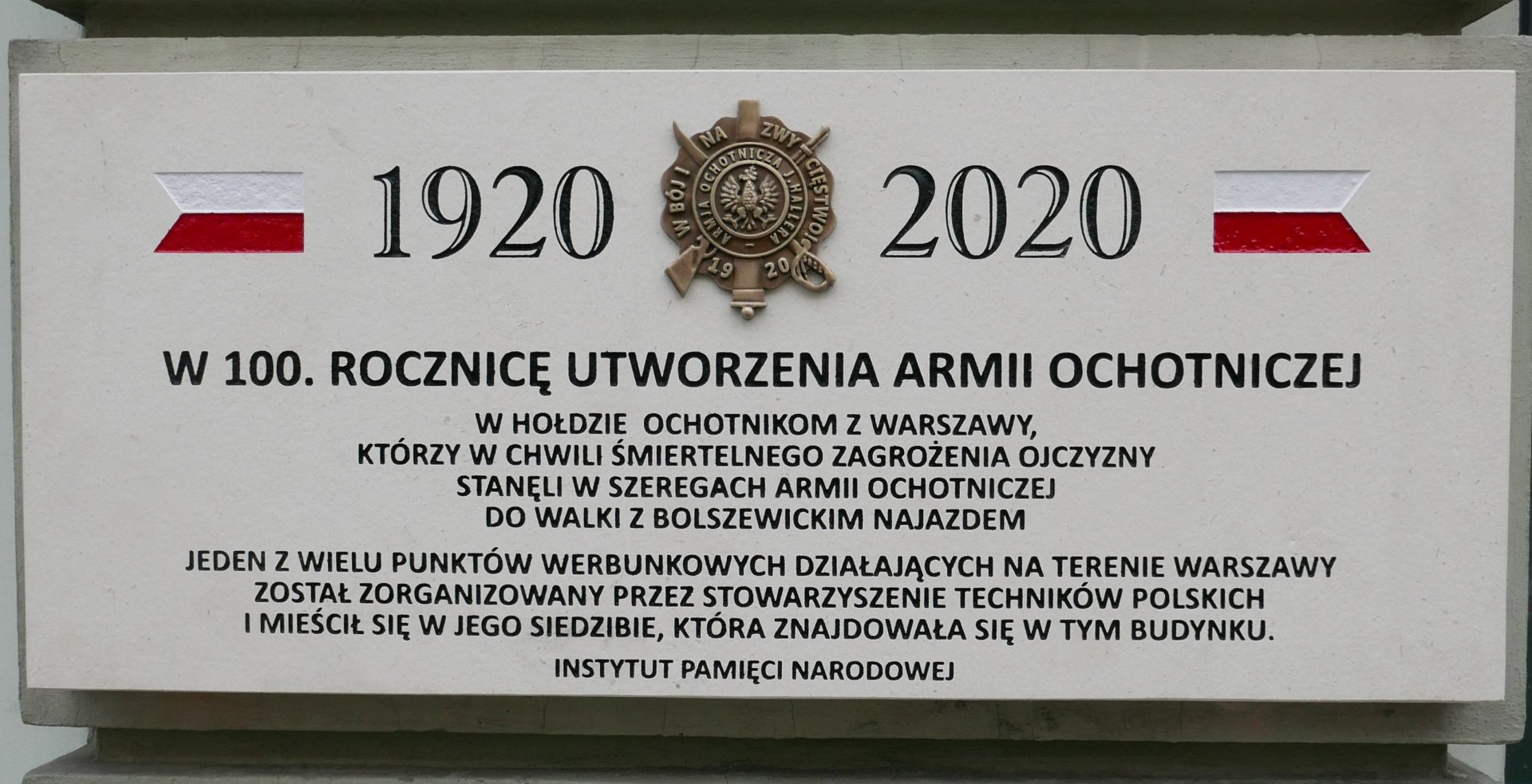 W związku z obchodami setnej rocznicy zwycięstwa nad bolszewikami w Bitwie Warszawskiej 1920 r., Instytut Pamięci Narodowej upamiętnia wydarzenie poprzez odsłonięcie tablic poświęconych Armii Ochotniczej 1920 roku w miejscach, w których znajdowały się punkty werbunkowe. Podczas środowych uroczystości, odsłonięto tablicę pod budynkiem Warszawskiego Domu Technika przy ulicy Czackiego 3/5.