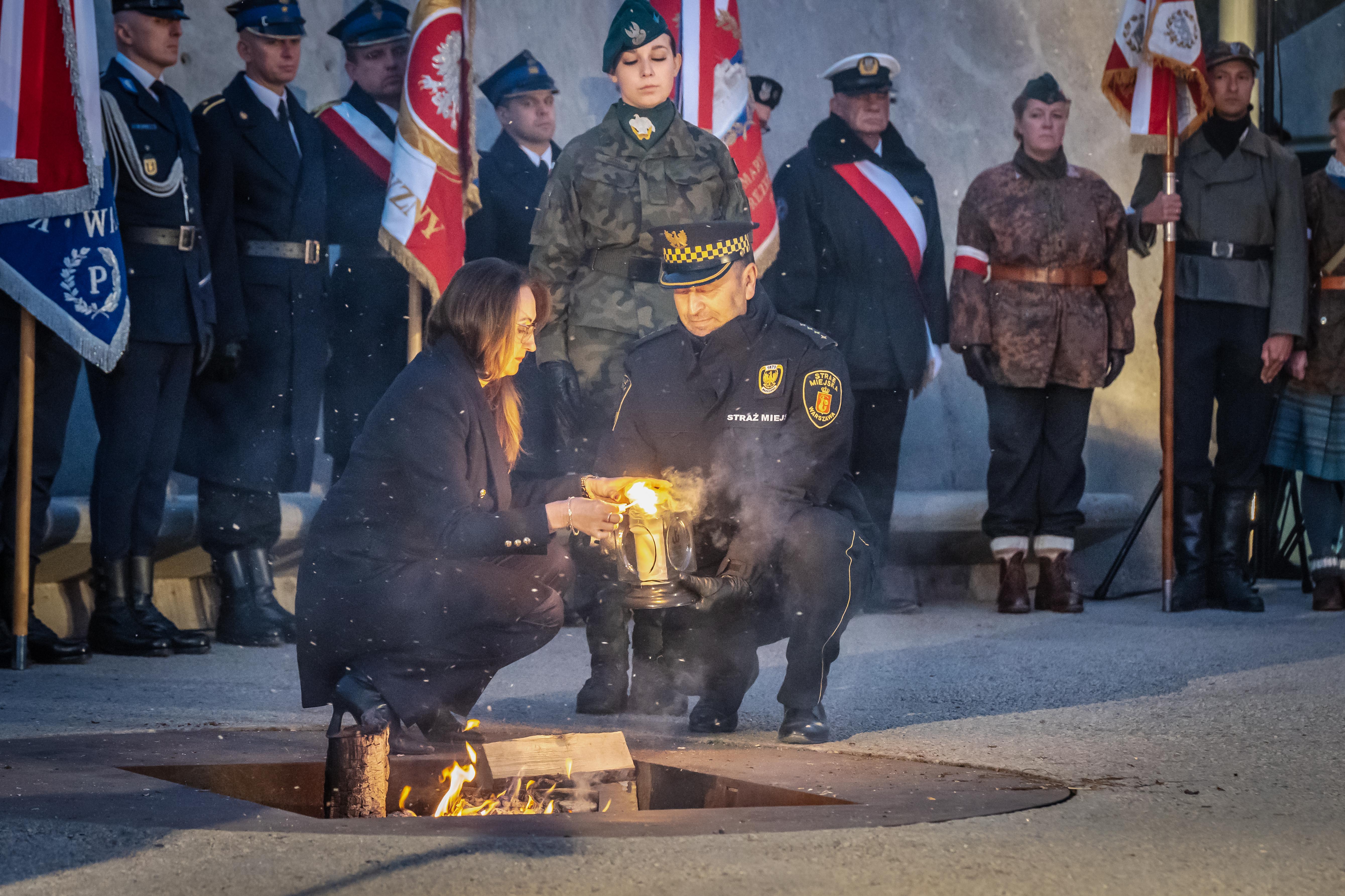 Kulminacyjnym aktem ceremonii było przeniesienie ognia przez sztafetę pokoleń, przyniosła go z Grobu Nieznanego Żołnierza na Kopiec, a po części oficjalnej ogień został symbolicznie wygaszony, kończąc tym samym oficjalne obchody.