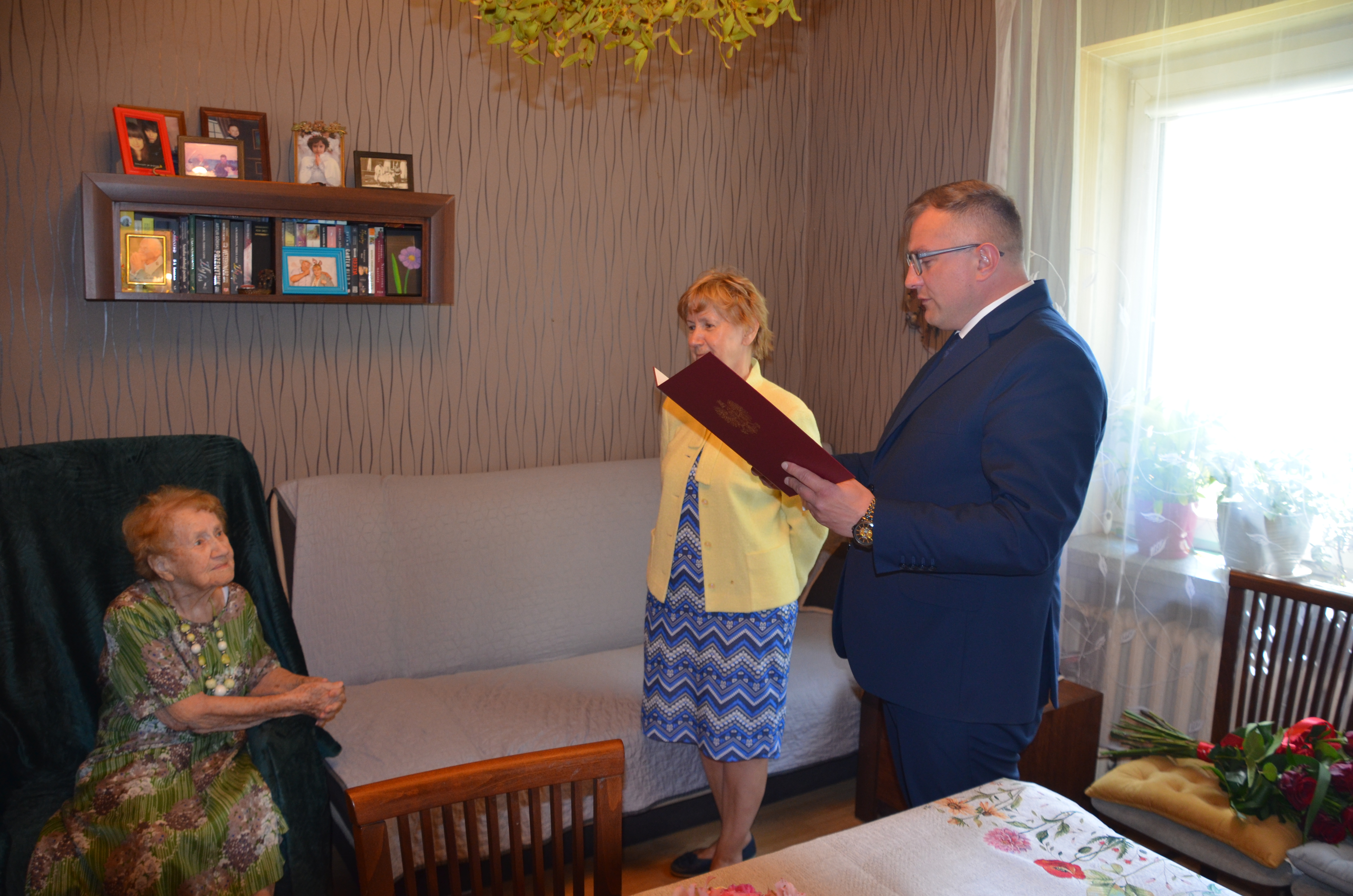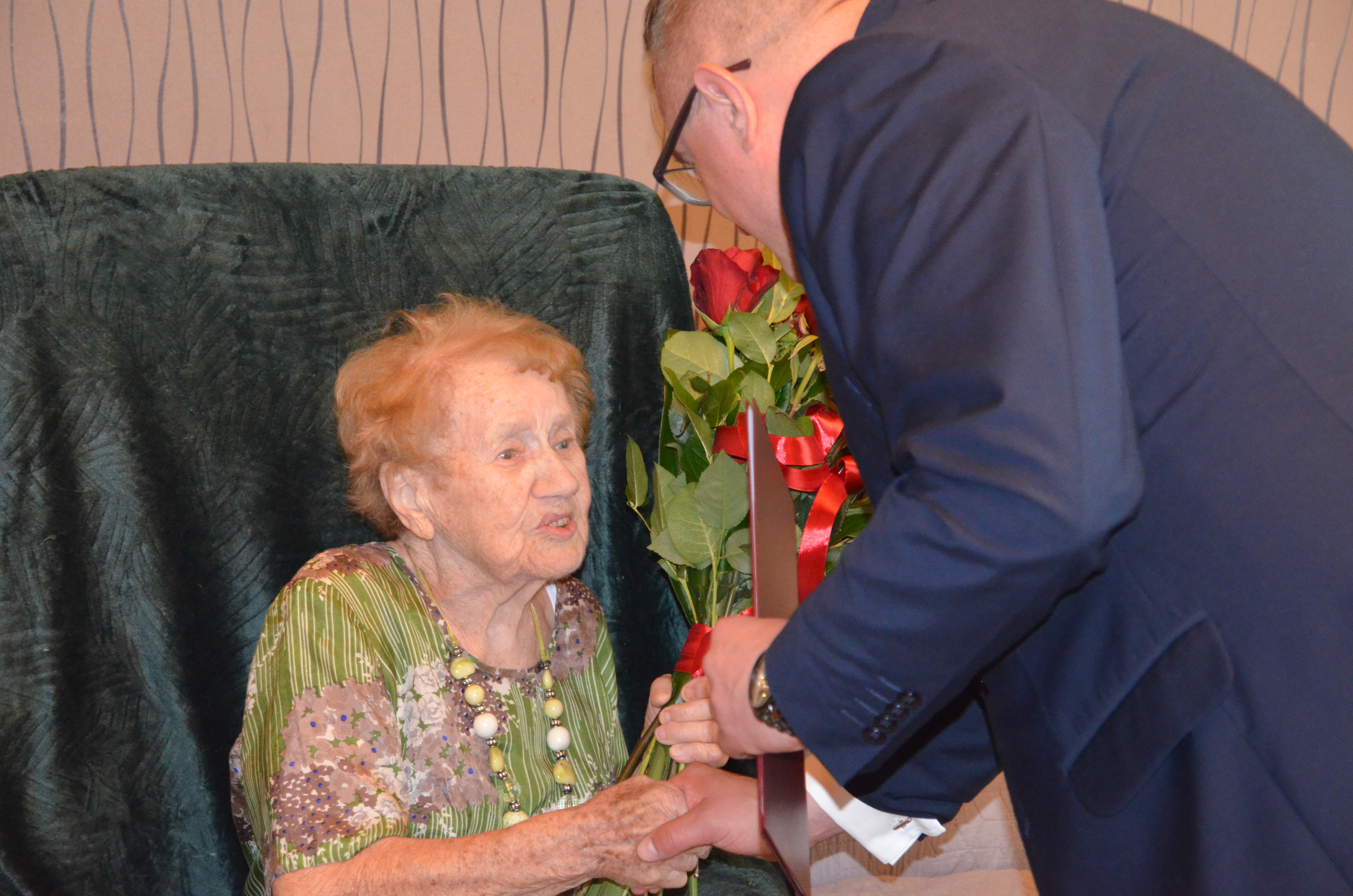 Po odczytaniu listu od Premiera RP, kierownik Delegatury Mazowieckiego Urzędu Wojewódzkiego w Radomiu Rafał Molga przekazał Pani Władysławie kwiaty, życzenia i gratulacje od wojewody mazowieckiego Mariusza Frankowskiego.