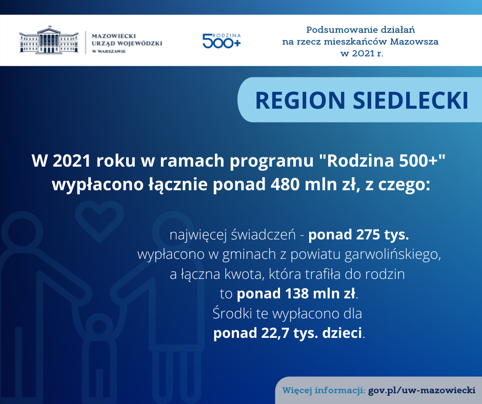 Z programu „Rodzina 500+” w województwie mazowieckim w 2021 r. średniomiesięcznie korzystało prawie 1 043 000 dzieci. Wypłacono łącznie ponad 12 680 000 świadczeń w kwocie przekraczającej 6,3 mld zł. Od 2022 roku Zakład Ubezpieczeń Społecznych przejął obsługę przyjmowania wniosków dotyczących programu „Rodzina 500+”.
