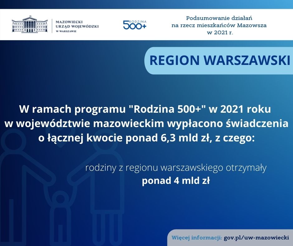 Z programu „Rodzina 500+” w województwie mazowieckim w 2021 r. średniomiesięcznie korzystało prawie 1 043 000 dzieci. Wypłacono łącznie ponad 12 680 000 świadczeń w kwocie przekraczającej 6,3 mld zł. Od 2022 roku Zakład Ubezpieczeń Społecznych przejął obsługę przyjmowania wniosków dotyczących programu „Rodzina 500+”.