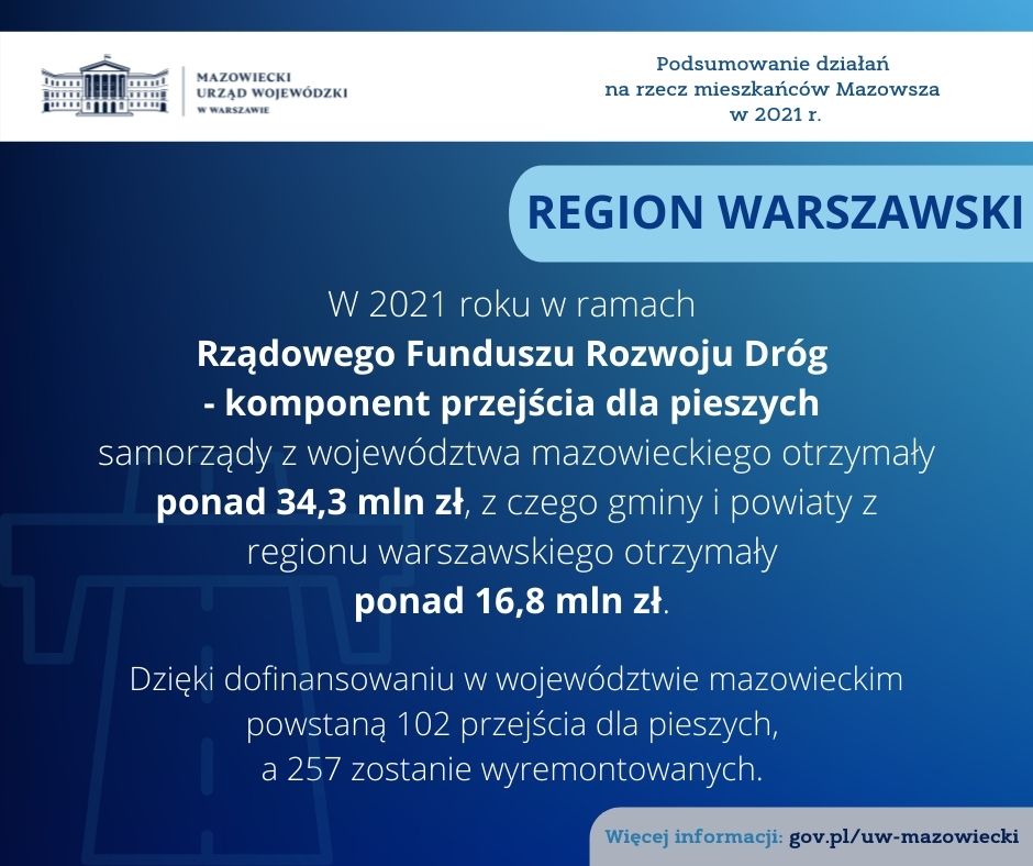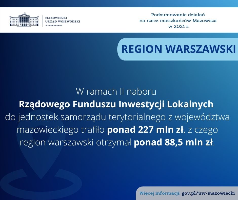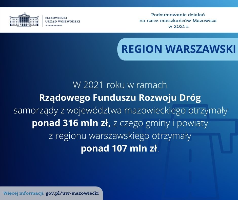 Ponad 88,5 mln zł dofinansowania w ramach Rządowego Funduszu Inwestycji Lokalnych, ponad 124 mln zł w ramach Rządowego Funduszu Rozwoju Dróg oraz ponad 20 mln zł na utworzenie 122 linii komunikacyjnych z Funduszu Rozwoju Przewozów Autobusowych otrzymał region warszawski w ubiegłym roku z programów rządowych. Do regionu warszawskiego trafi również ponad 834 mln zł z pierwszego naboru Programu Inwestycji Strategicznych, w ramach Rządowego Funduszu Polski Ład.