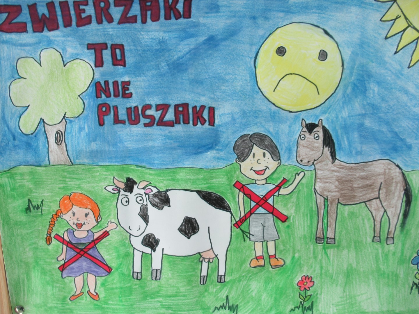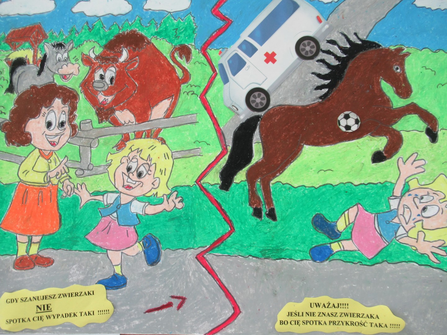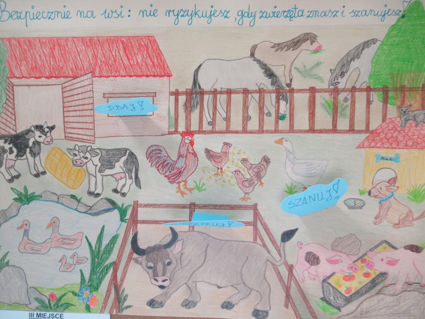 Aby przystąpić do Konkursu należało wykonać pracę plastyczną w formacie A3, w dowolnej technice na temat zapobiegania wypadkom związanym z obecnością zwierząt w gospodarstwach.