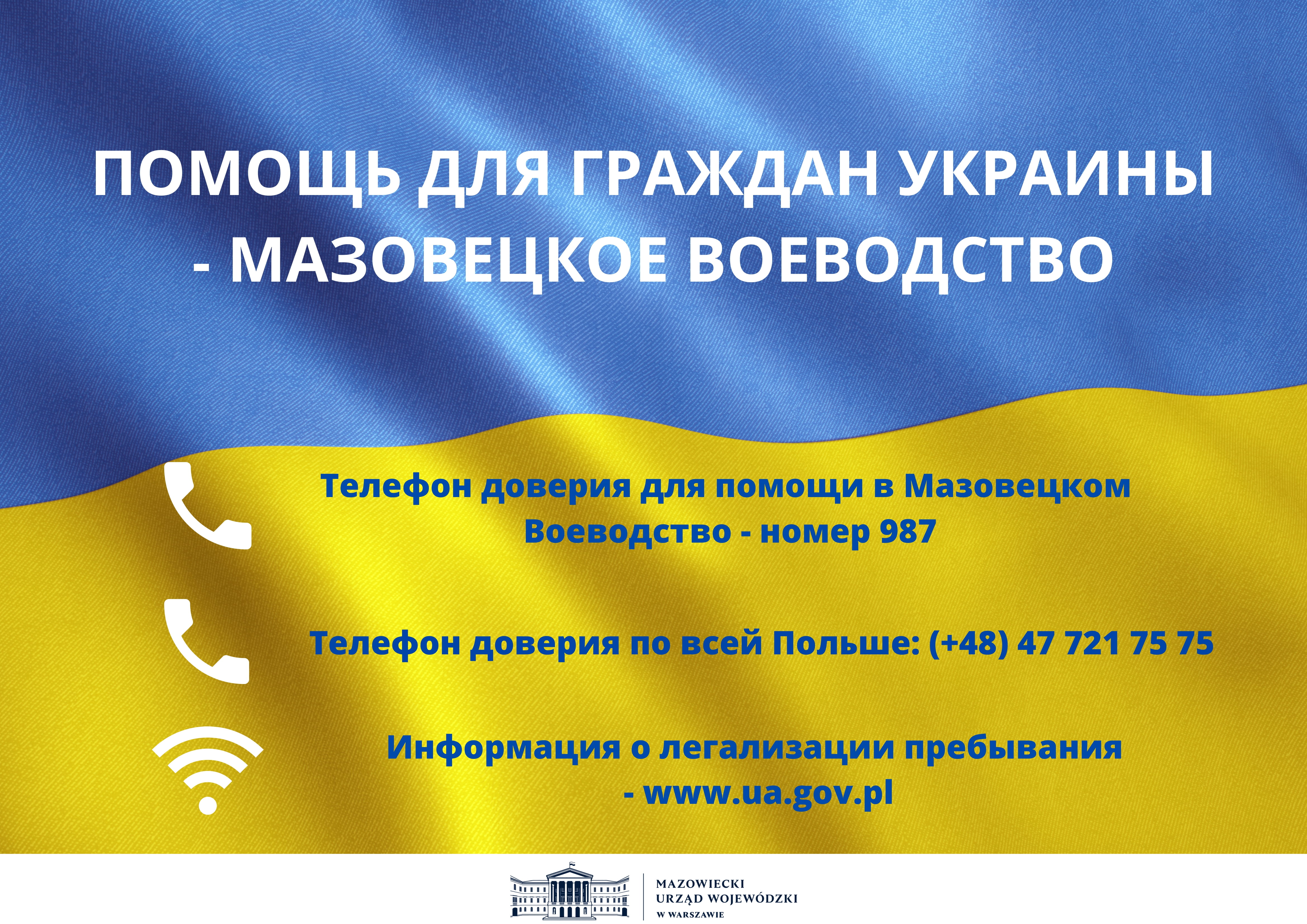 Pracownicy Mazowieckiego Urzędu Wojewódzkiego udzielają obywatelom Ukrainy informacji na temat legalizacji pobytu w punktach informacyjnych m.st. Warszawy. MUW uruchomił też całodobową infolinię pod numerem 987, obsługiwaną również w języku ukraińskim.