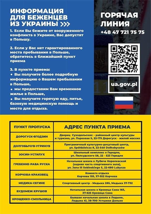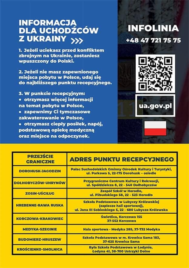 Aby uzyskać informacje, w zakresie m.in.: punktów recepcyjnych, czy ogólnych warunków i zasad wjazdu i pobytu w Polsce można też zadzwonić pod ogólnopolski numer: +48 47 721 75 75. Ministerstwo Spraw Zagranicznych przypomina, że obywatele polscy, którzy przebywają na Ukrainie, powinni natychmiast opuścić jej terytorium.